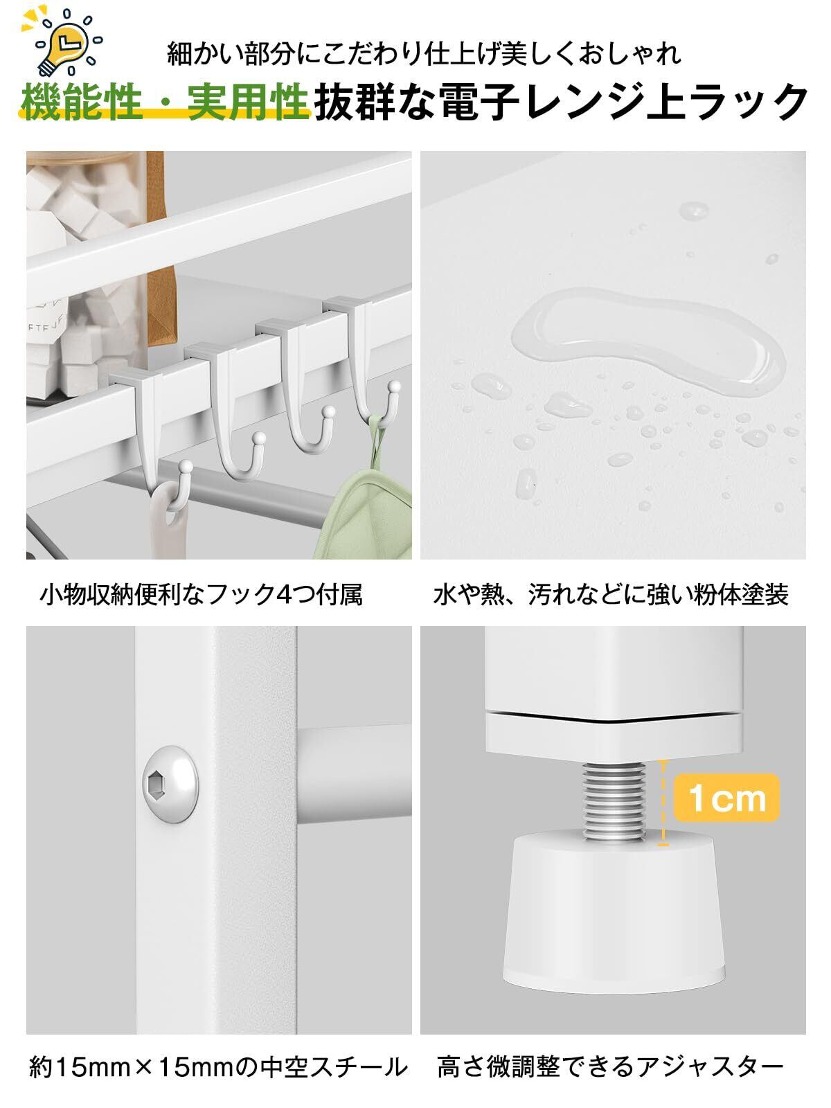 【幅伸縮自在&高さ3段調節】収納ラックの幅の伸縮範囲は39cm~65 cm(外寸)の間で無段階に調節でき、可動棚板は約5cm間隔で3段階で高さ調節可能。電子レンジやオーブン等の小家電に適用し、調味用品、キッチン用品を簡単に綺麗に収納できます。上層の両側は手すり設計を採用し、置物倒れ防止する上、小物を掛けるのに便利なフックが4個付属。キッチンバサミや鍋つかみなどが掛けられます。四つの足の高さも微調整可能で、デスクトップのバランスが崩れている場合は、棚の脚を回転させて高さを調整し、バランスをとることができます。
