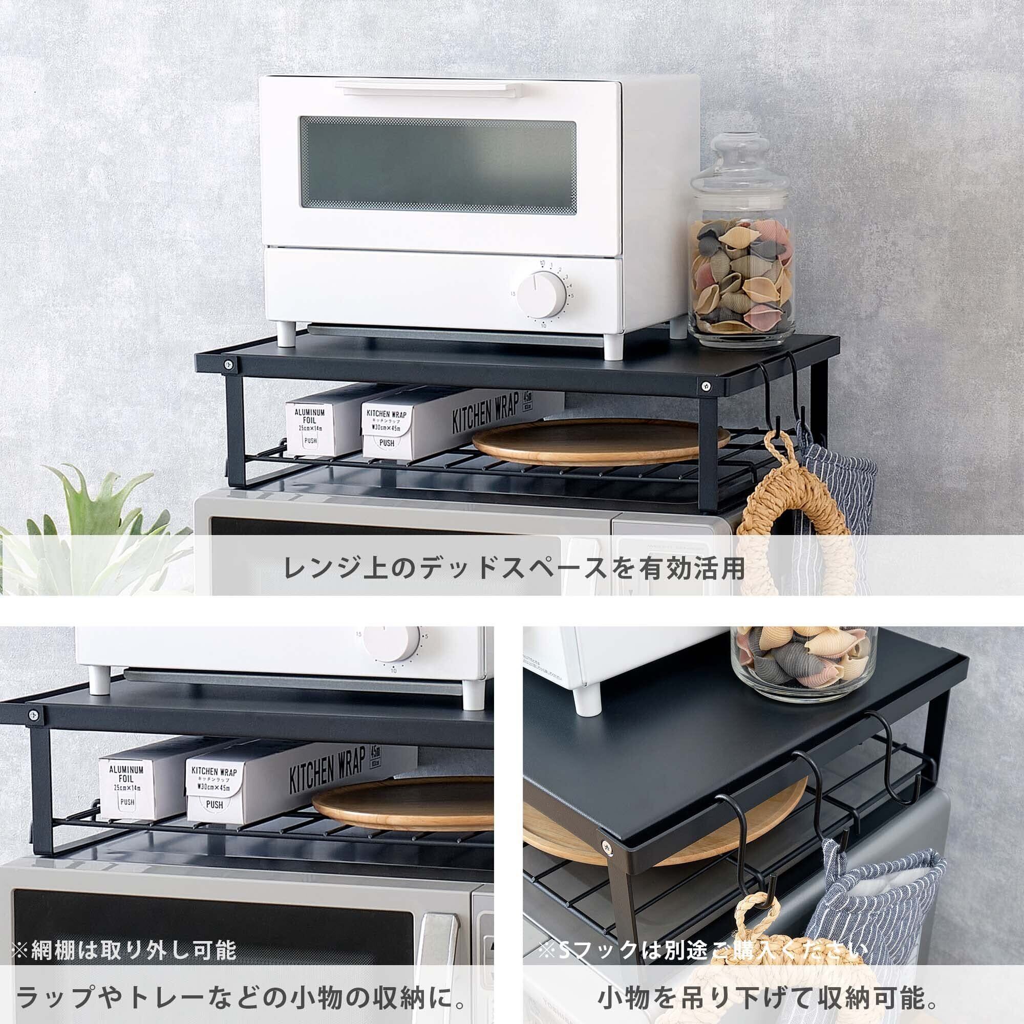 レンジ上にトースターや小物をスッキリ収納。脚の床面は耐熱200˚のシリコン製すべり止めゴム付きで安心設計。