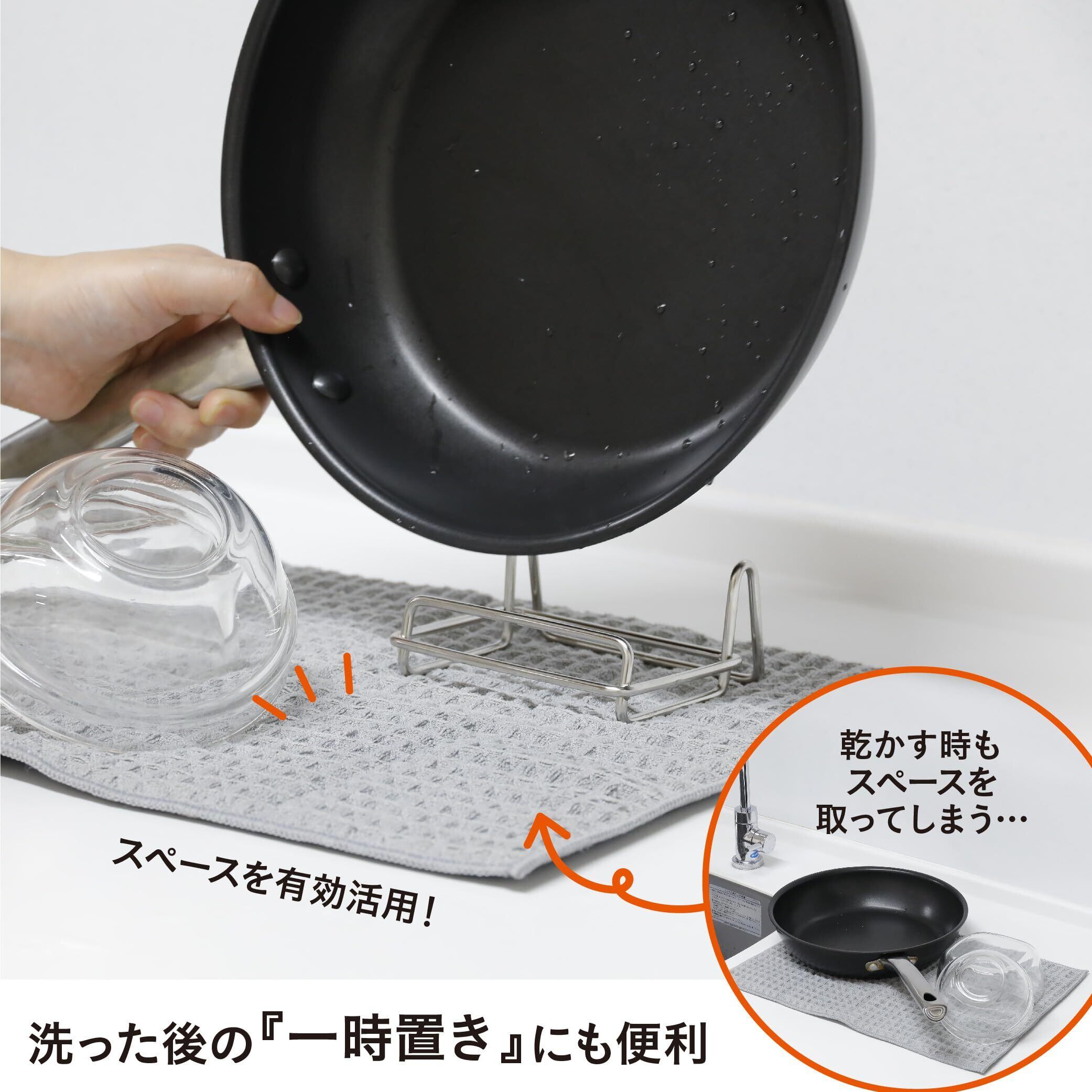 洗い終わった後、乾かす場所に困りがちなフライパンを立てて乾かせます。立てることで水滴も流れやすくなります。フライパンを立てることで、お皿やコップなどの他の洗い物を置くスペースを確保できます。