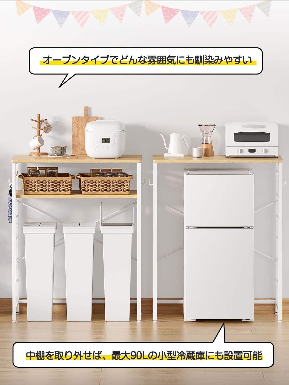 【水や傷に強い耐荷重70Kg天板】 水と傷に強く、耐久性の高いメラミン化粧板を使っています。水をこぼしても、すぐ拭き取れます。幅80cmで、30Lのゴミ箱を3個置けるちょうどいいサイズです。高品質材料使用し、大型の家電でも安心で置けます。電子レンジ、オーブントースターや炊飯器、コーヒーメーカー、食洗機、電気ポットなどの様々な家電収納可能です。