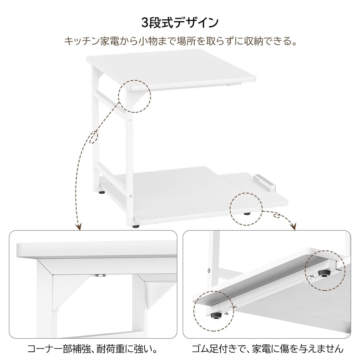 【レンジラック】冷蔵庫ラックは3段式デザインで、キッチン家電や小物を仕分けして格納できます。オーペン式なので、必要な物をおいて置けるに便利し、取り出しもやすいです。頑丈で高耐久なスチールや分厚な木材を採用され、電子レンジ、オーブンレンジ、炊飯器、トースターや、ポット、コーヒーメーカーなど普段使う重たい家電も置けます。