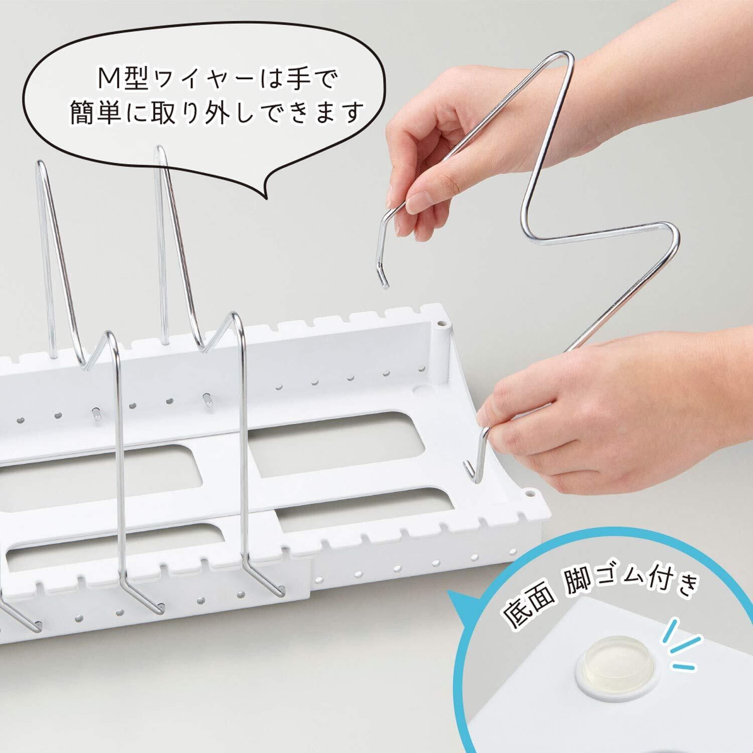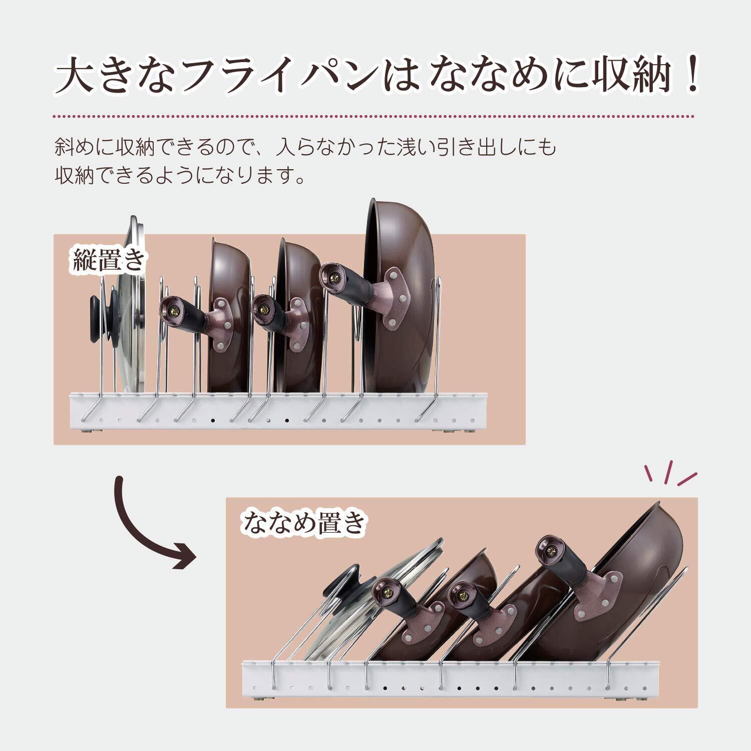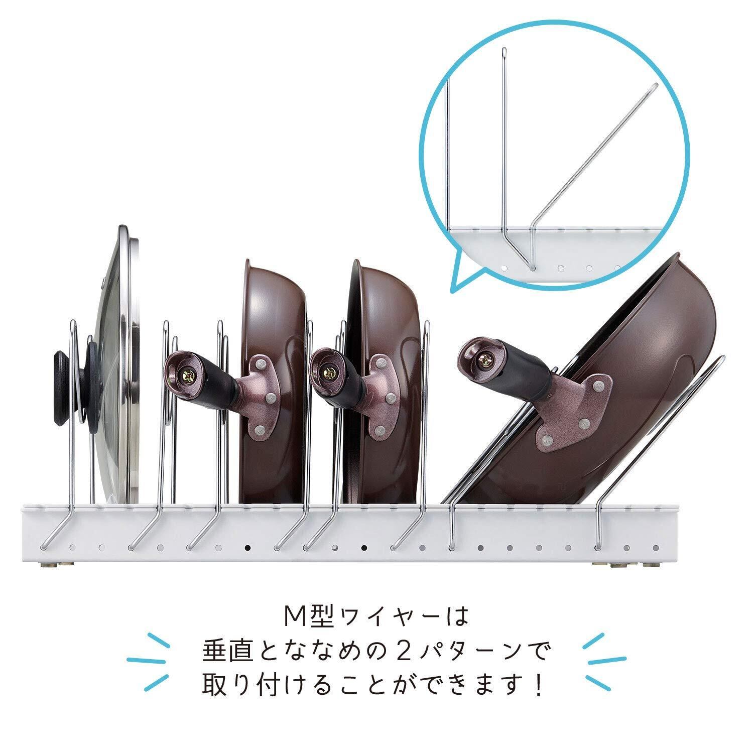 ・M型ワイヤーを垂直と斜めの2パターンで取付可能、大きなフライパンも収納できます。