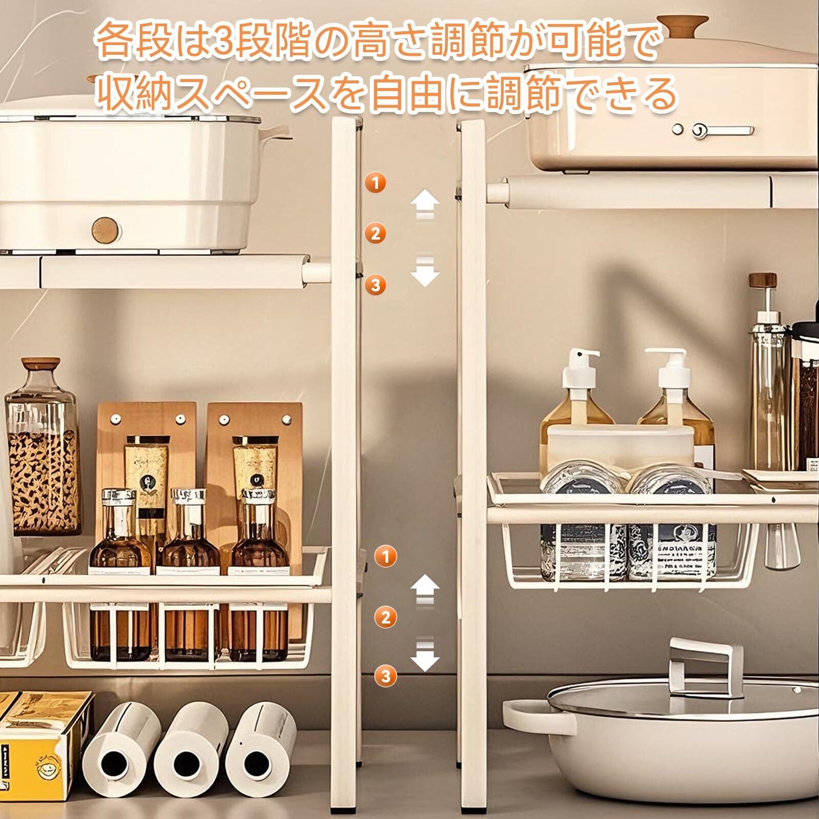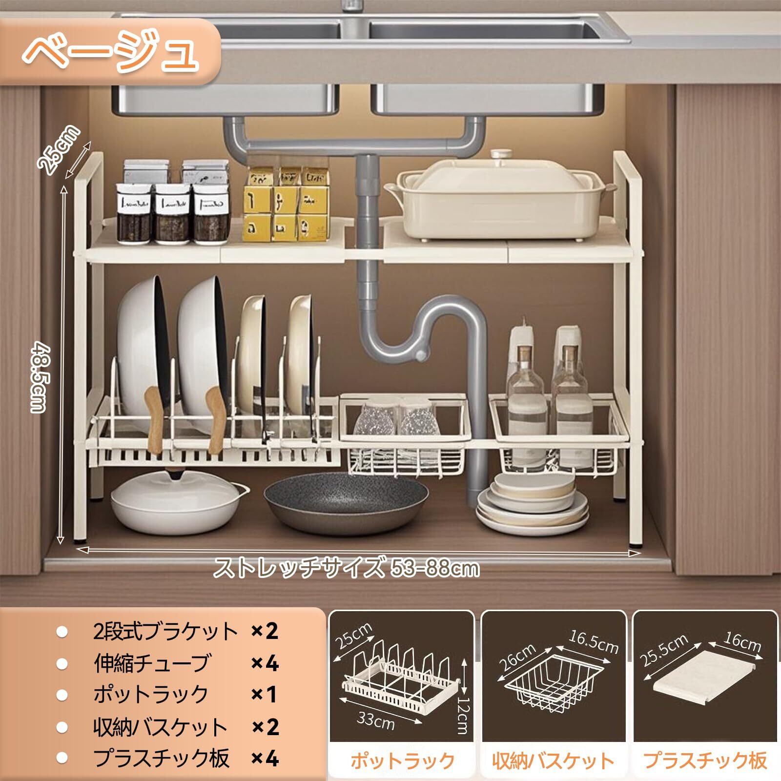 【収納ラック仕様】横幅53~88cm×奥行き25cm×高さ48.5cm、収納バスケット:26×16.5×7cm、収納ボード:25.5*16cm、鍋収納ラック:25*33*12cm;各層の高さは5cmを1段階として上下に調整でき、合計3段階。2段伸縮式ラックには、2段式ブラケット×2、伸縮チューブ×4、鍋収納ラック×1、収納バスケット×2、収納ボード×4