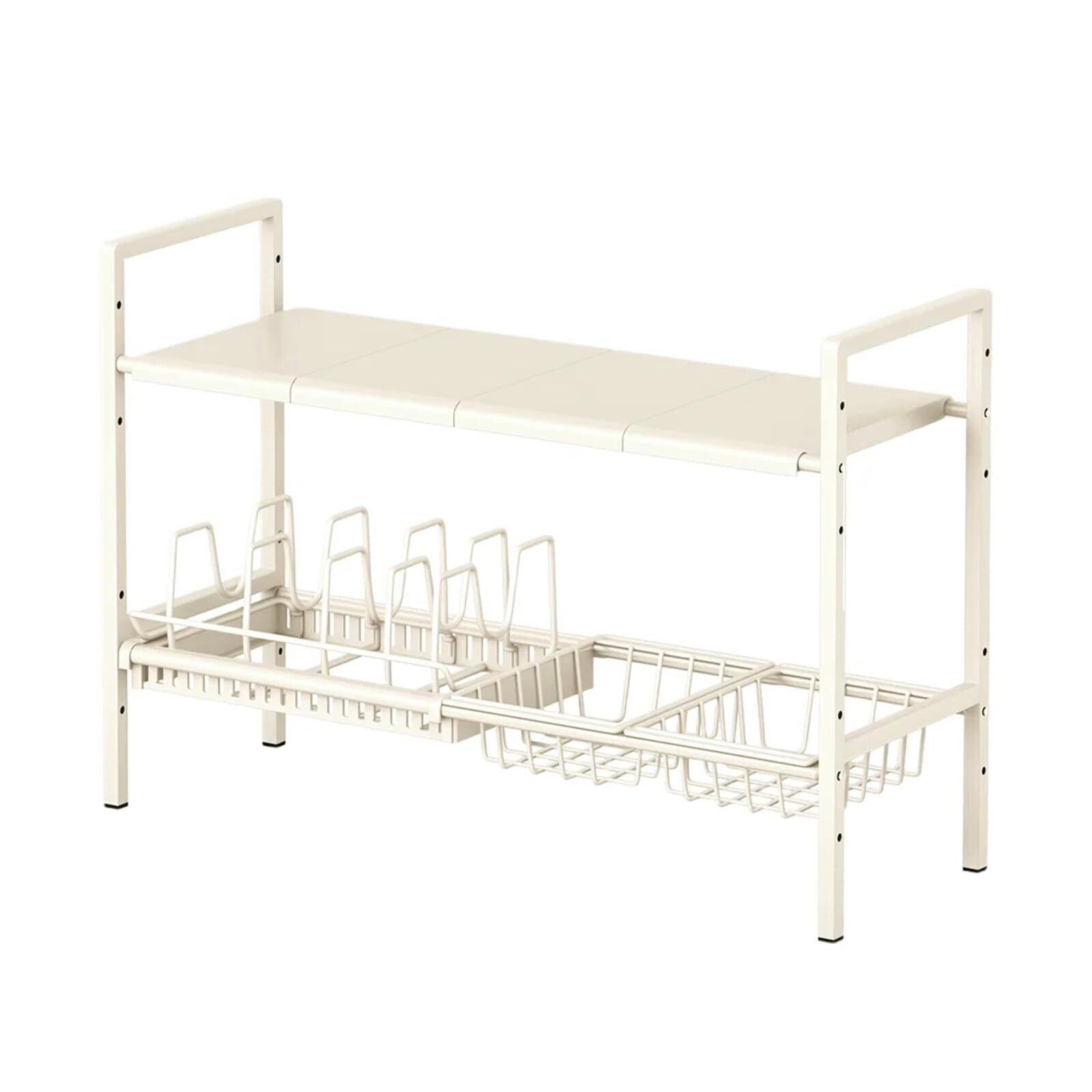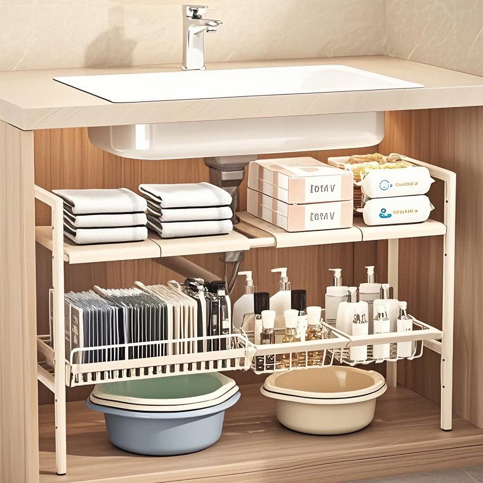 sclusi シンク下収納 キッチンフリーラック 伸縮棚 高さ調整 横幅伸縮 洗面所下収納棚 2段収納 食器フライパン置き 台所下ラック 二層W(53-88)×D25×H48.5cm(ベージュ)