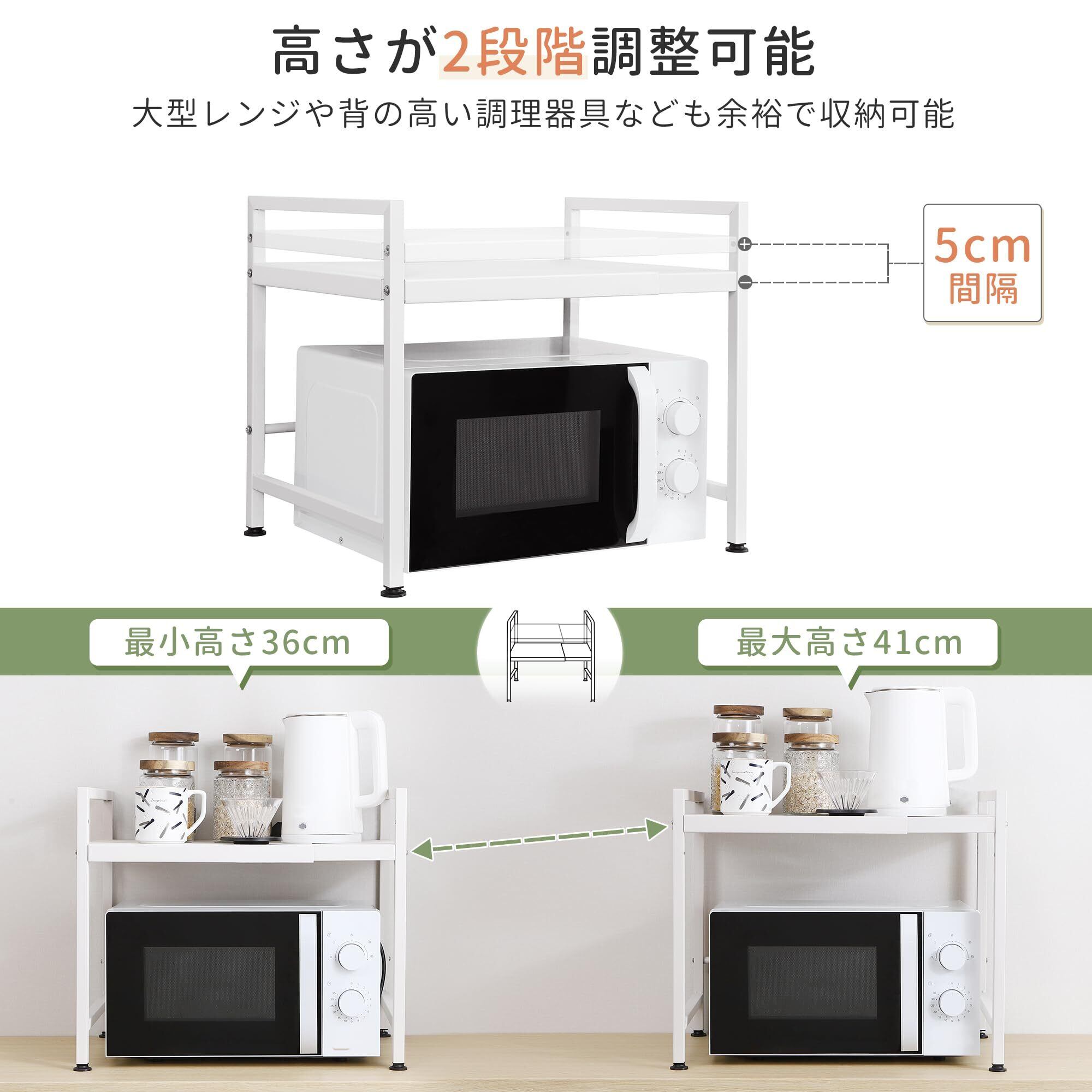 【背の高い調理器具にも対応】棚の高さは2段階調節可能。棚下の高さは最大41cmにできるので、大型レンジや背の高い調理器具なども余裕で収納可能。