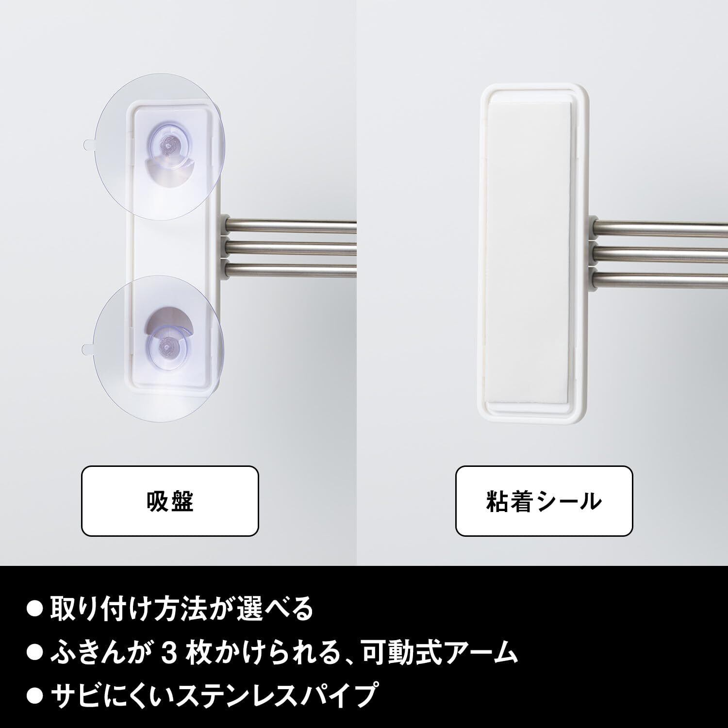 ●吸盤と粘着テープ2つの取り付け方法が選べます。