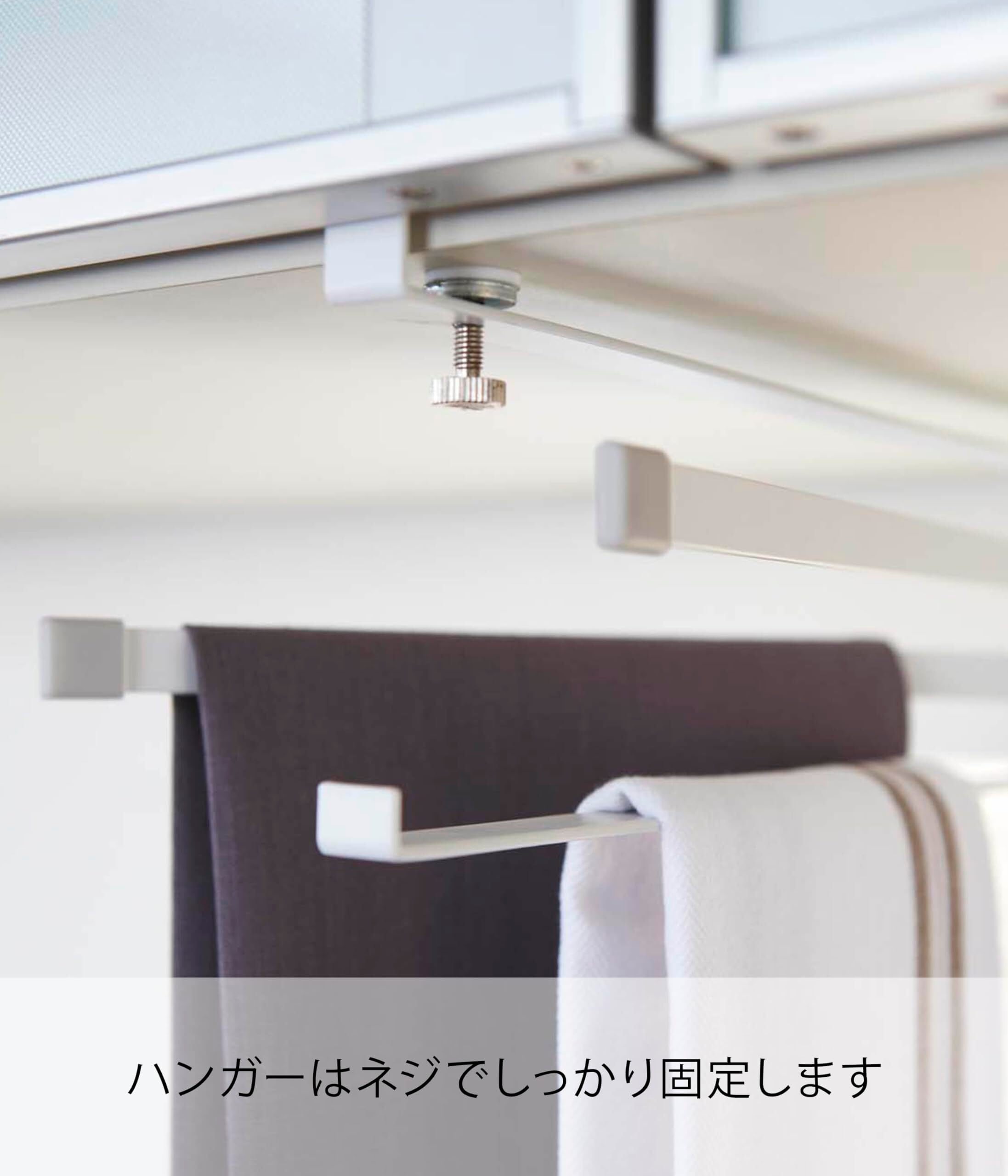 ●吊り戸棚に簡単取り付けの布巾ハンガー。ネジでしっかり固定!