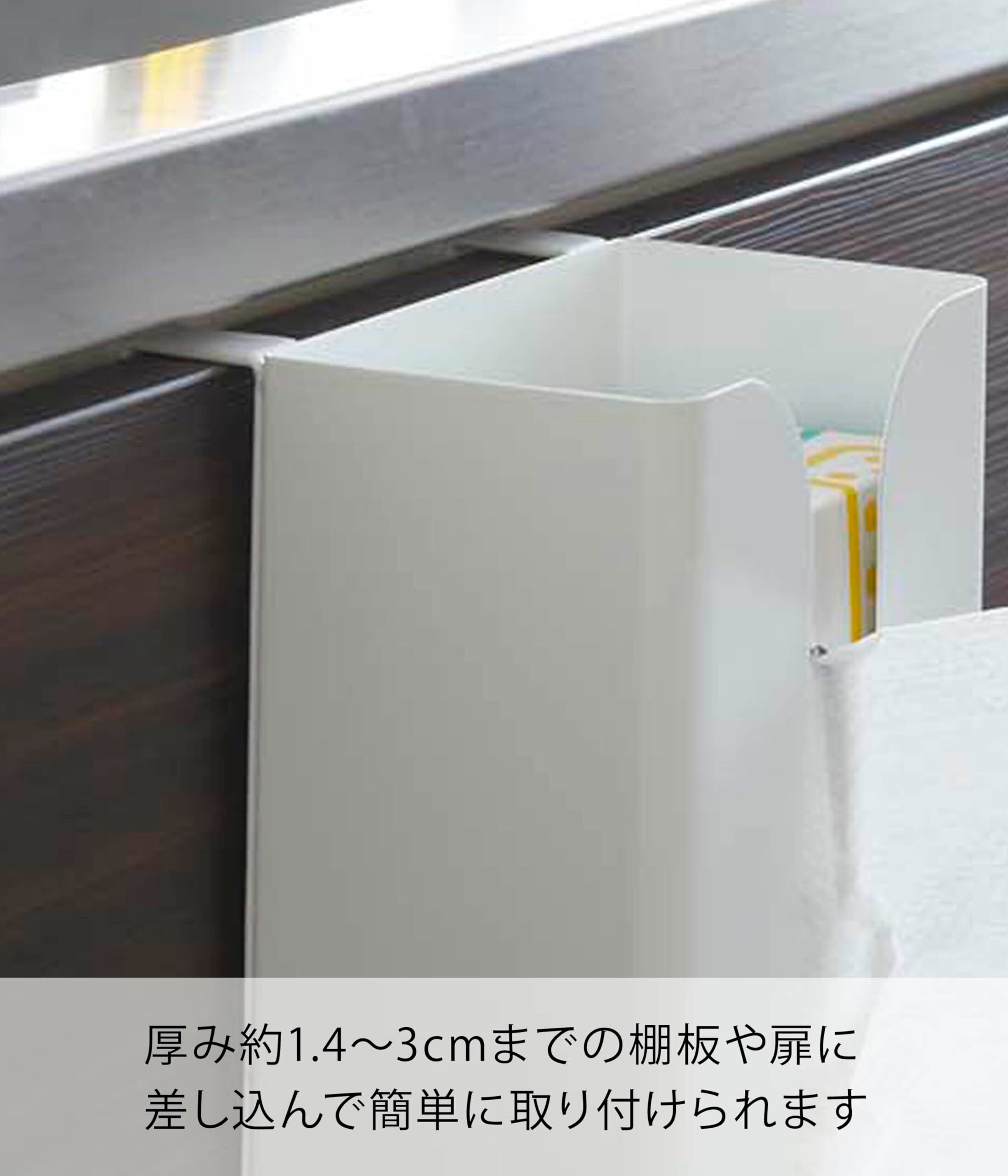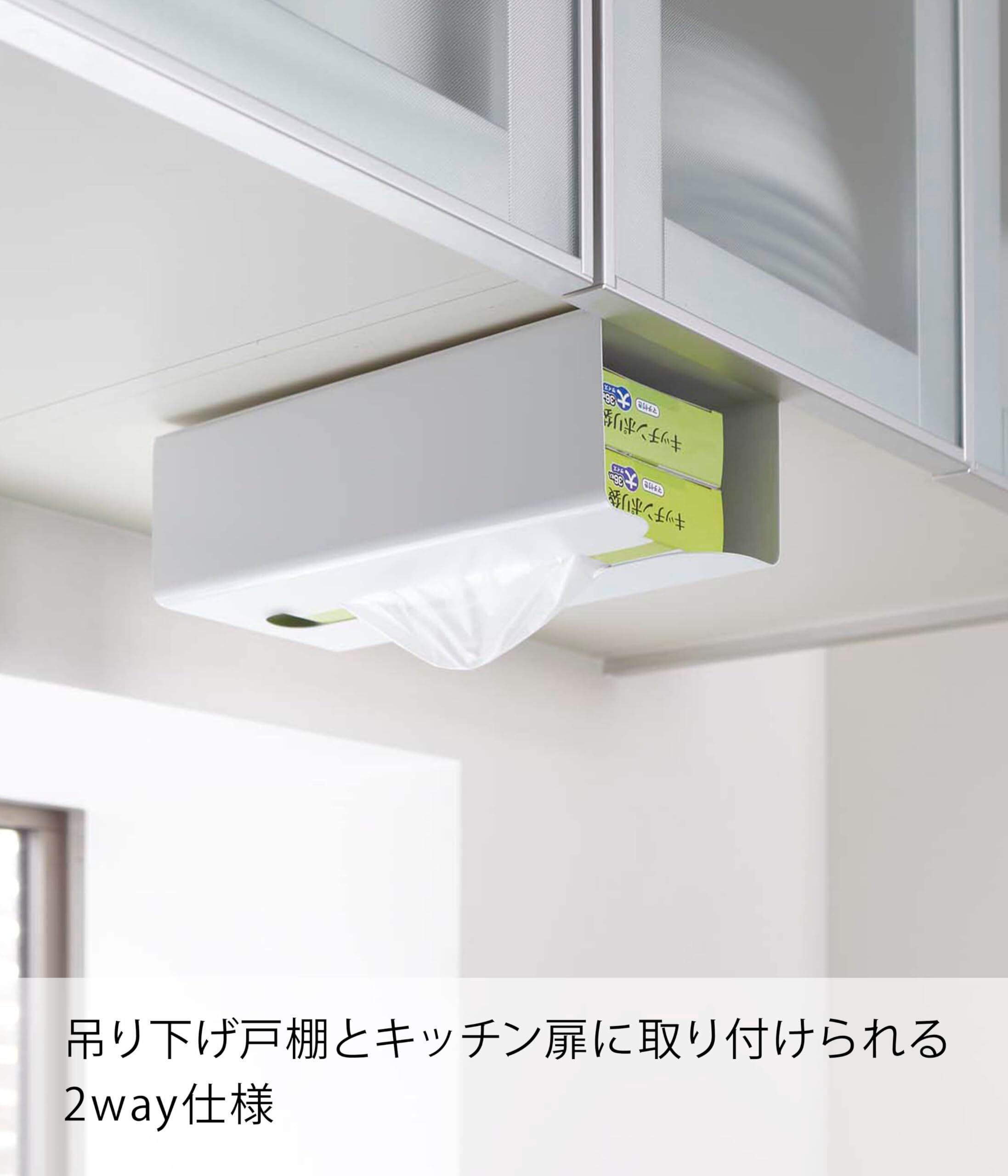 戸棚下やキッチン扉に!使い方はアイデア次第!吊り下げ戸棚とキッチン扉の2つの場所で使える2ウェイホルダー。ポリ袋・キッチンペーパーなどのストック場所としても便利。