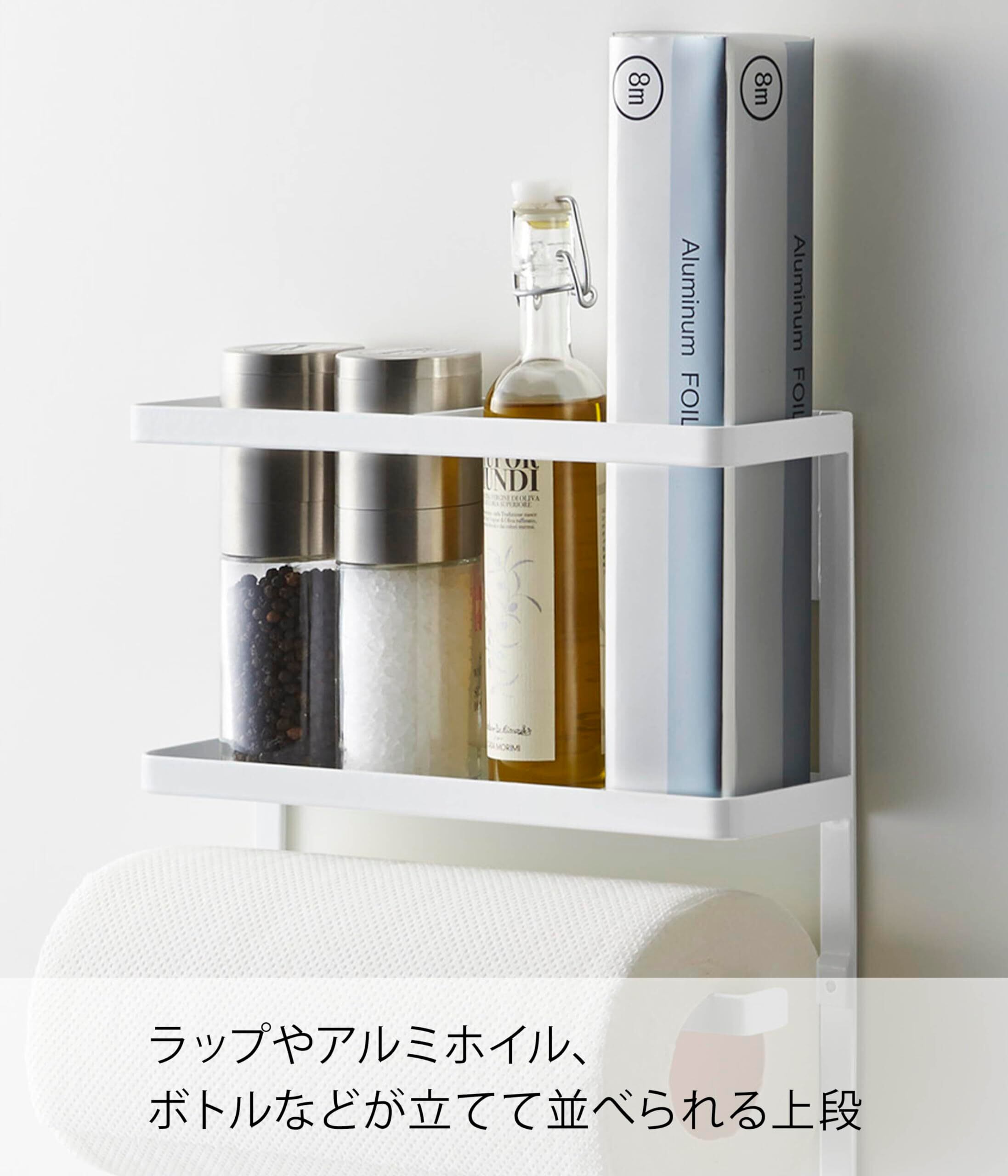 冷蔵庫側面に磁石で簡単取り付け。よく使うキッチン小物を一括収納。よく使うキッチン小物や調理道具を掛ければ、作業がスムーズになり、調理時間を短縮できます。 ハンガーはハンドスプレーやゴム手袋も掛けられます。レシピ本や調味料なども立てて収納できます。上段は、よく使うラップやアルミホイルを立てて入れることができます。中段は、キッチンペーパーや布巾を掛けられるハンガーが2本、下段は、鍋つかみ、栓抜き、缶切りなどを吊るせるフックが6本ついています。