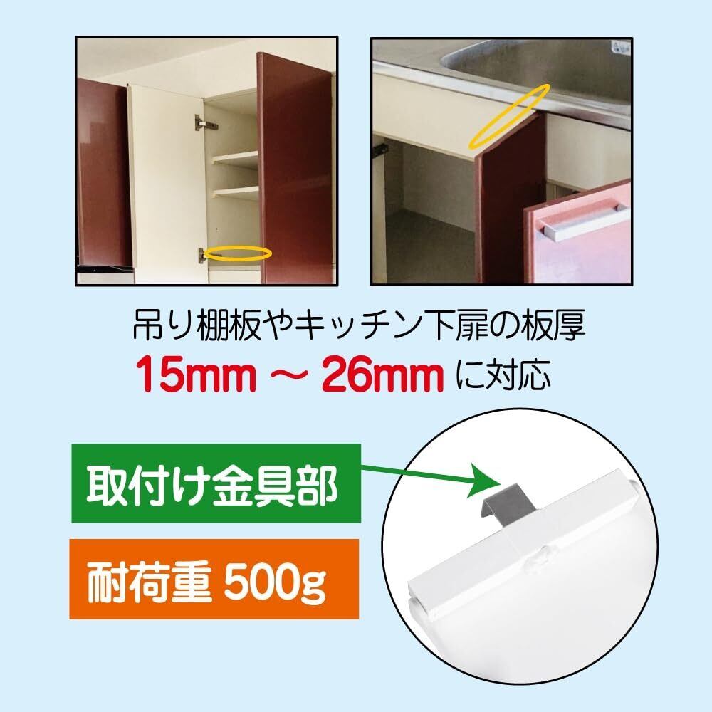 【簡単取り付け】 金属製の金具で吊り戸棚やキッチン下扉にしっかり挟み込む設計。ネジや穴あけ不要で、誰でも簡単に取り付け可能。