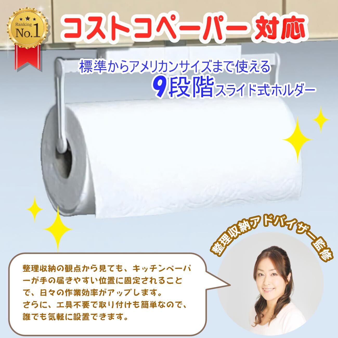 【整理収納アドバイザー監修】キッチンペーパーホルダー 国産 コストコ 対応 日本製 スライド式 9段階 横幅 調整 大判サイズ対応 吊るす 吊り下げ アメリカンサイズ EXLEAD