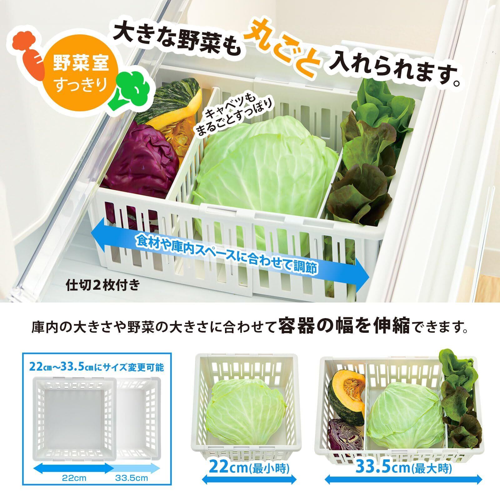 仕切り板2枚付き。収納する食材の大きさに合わせてさらに細かくスペースを調整できます。