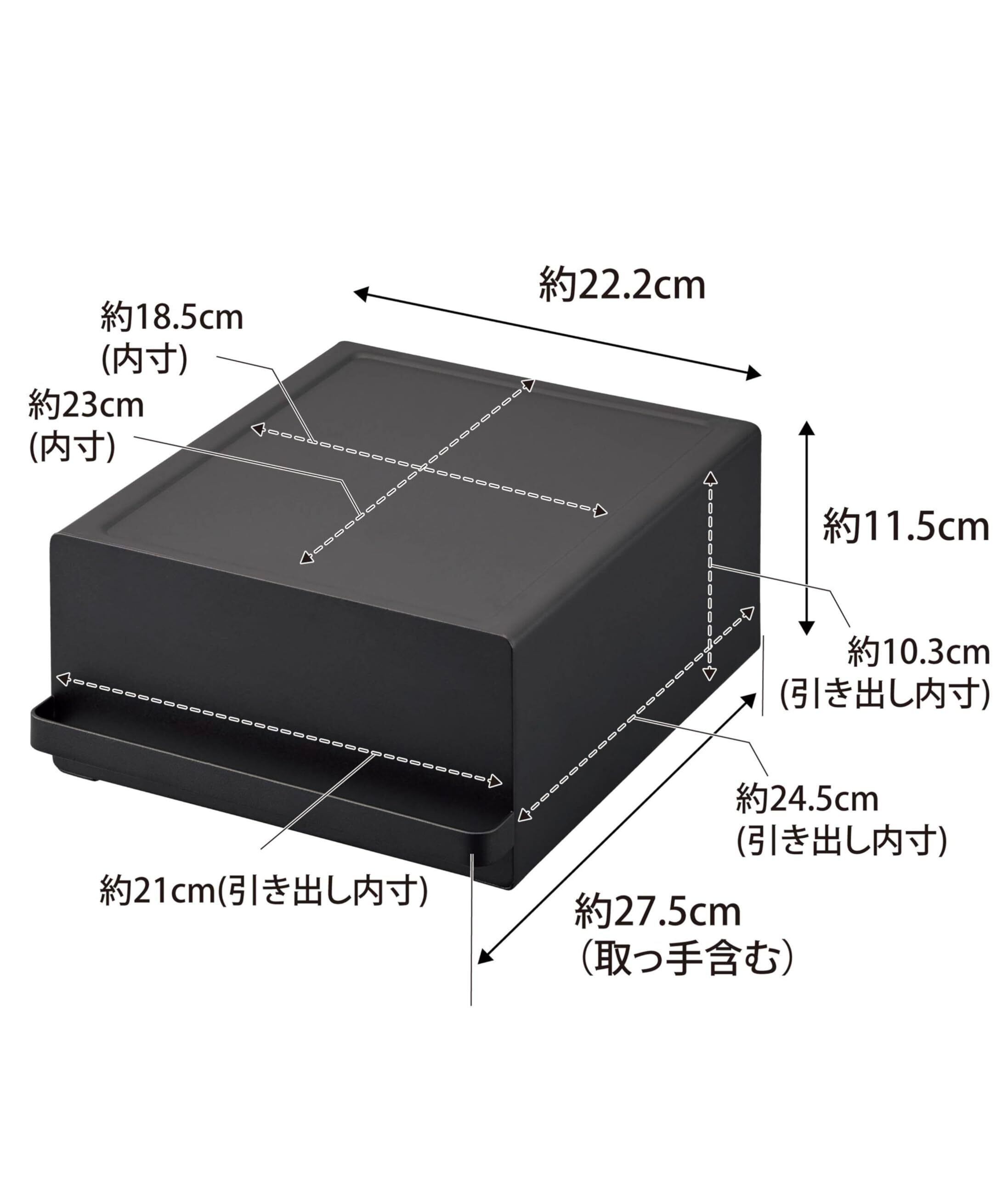 内寸サイズ:上段(凹み部分):約W18.5×D23cm、引き出し:約W21×D24.5×H10.3cm(仕切り板含まず)