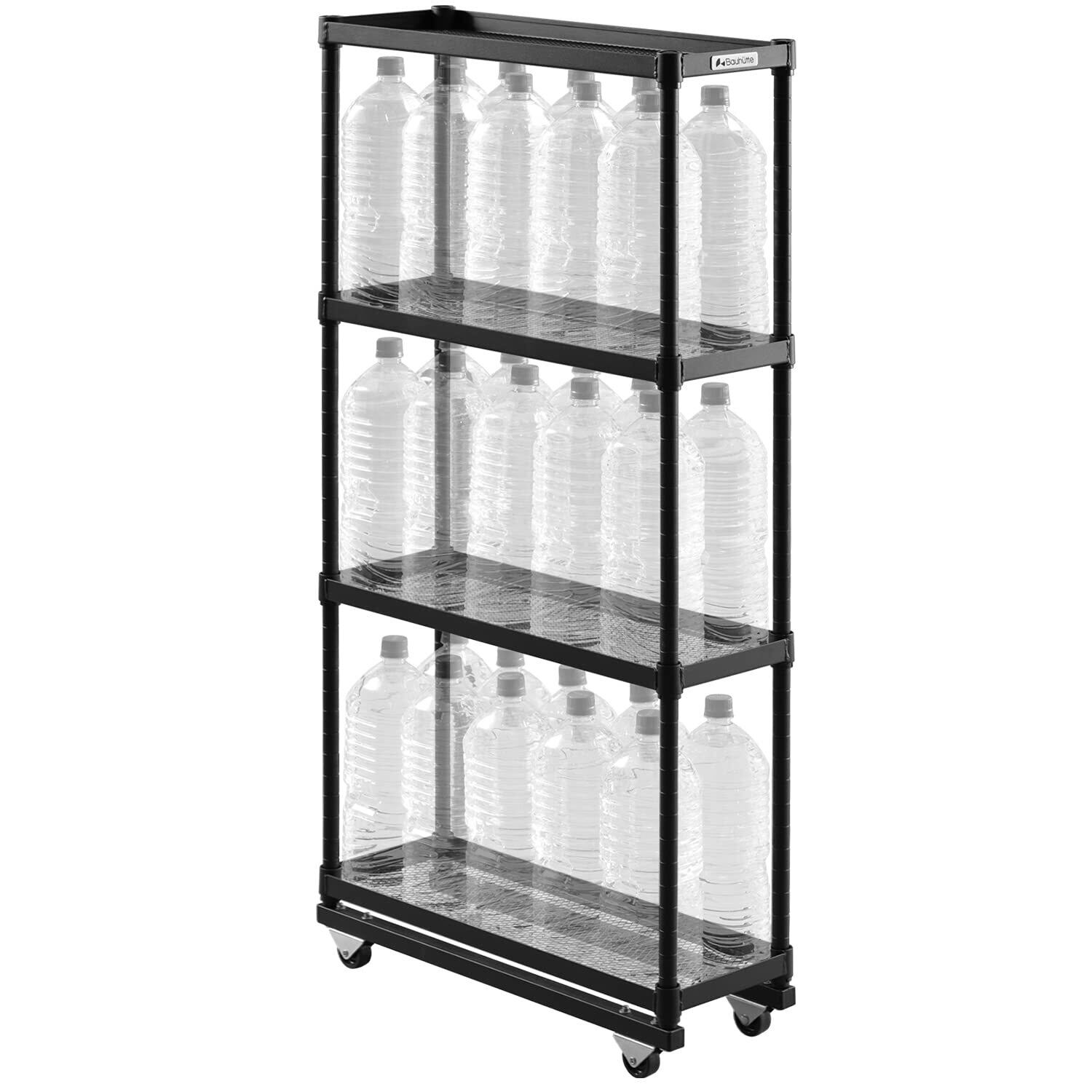 ◆スリムボトルラックラージ BHS-200-BK 『箱買いペットボトルがすっきり片付く ストックに便利な隙間収納』まとめ買いで届いた沢山のペットボトルの置き場所は購入したままのダンボールの中ではありませんか? スリムボトルラックラージは、キッチンの狭い隙間やデッドスペースを利用して、一台で大量のペットボトルの収納・保管が可能です。 網目の細かいファインメッシュを採用した棚板なので、ホコリも溜まりにくく、凹凸のある炭酸飲料も安定して収納できます。 ◆まるごとすっきり大容量収納 冷蔵庫横などのちょっとした隙間にぴったりのスリム形状ながら、 ダンボール数箱分のペットボトルをまるごと保管できます。 箱買いで大量に届いたペットボトルを、すっきりひとまとめに収納可能です。 スタンダードタイプ:500ml飲料×最大48本(約1~2箱分) ラージタイプ:2L飲料×最大30本(約3~4箱分) ◆ボトル収納に特化した専用ラック ペットボトルの一般的な寸法規格にあわせたサイズ設計で、 それぞれ500ml/2Lペットボトルをぴったり隙間なく収納できます。