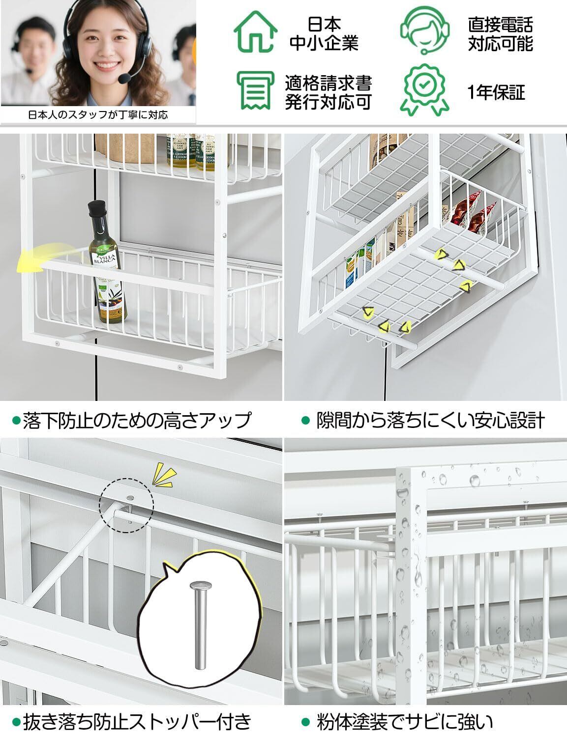 特徴 2Way置き方:自立置き、マグネット, 上段下段合計耐荷重約40Kg, 小物落下防止中敷きつき, 左右どちらにも引き出せる, 落下防止サイドフレーム高めの設計