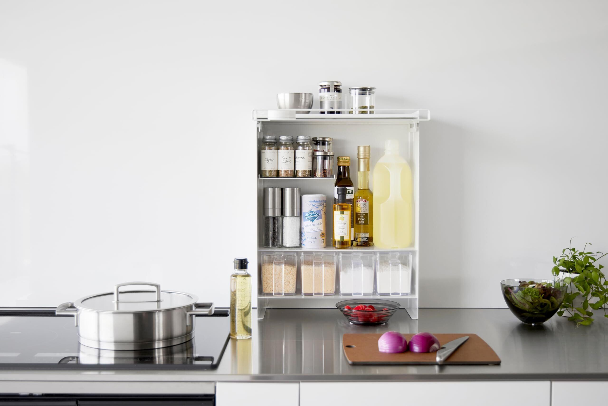 調味料ボトルやスパイス類を隠して一括収納!汚れからガードします。