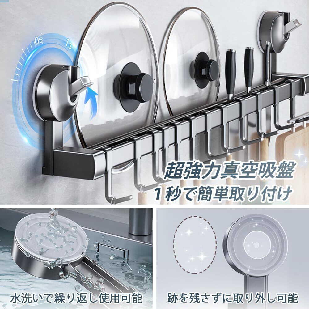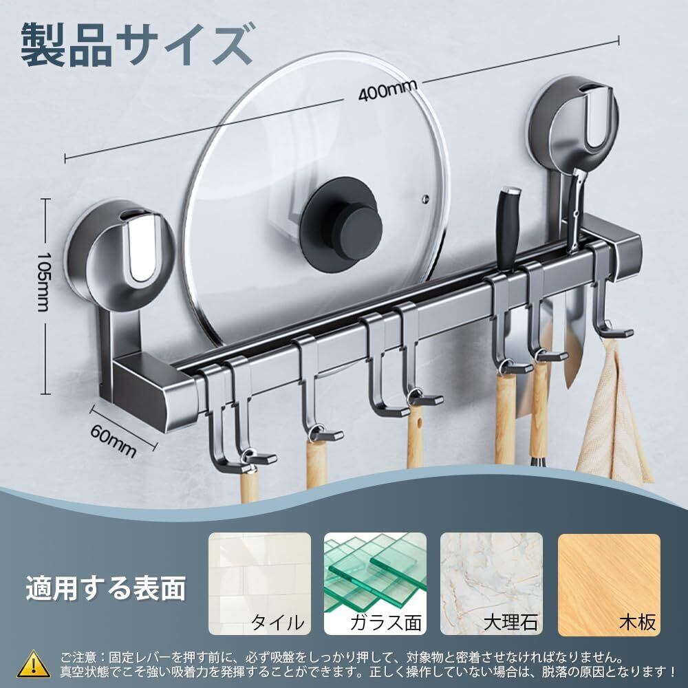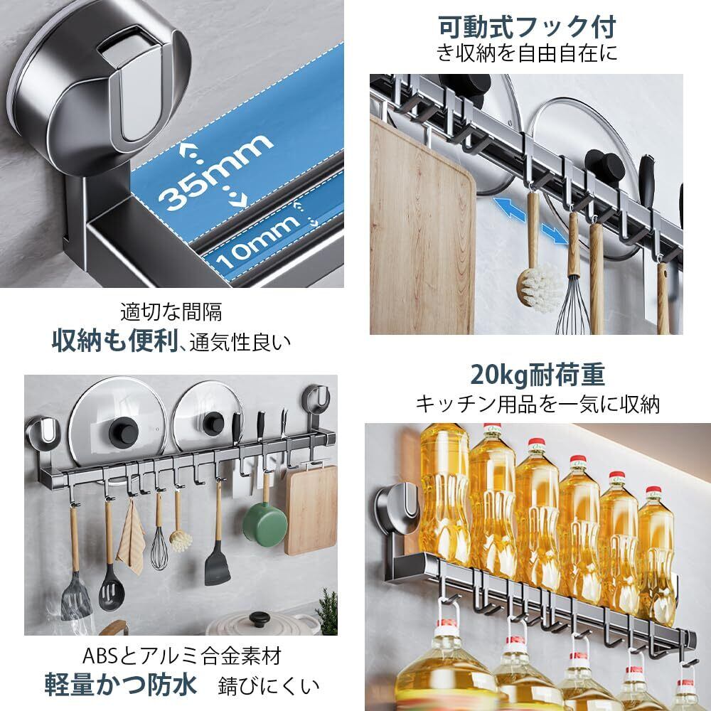 キッチンツールフック 吸盤 フック 強力 アルミニウム キッチンラック 防水防錆 キッチン収納 調理器具 鍋蓋置き キッチンツール 収納 壁掛け 可動式フック 壁 傷つけない 40cm 8個フック (グレー, 幅40cm)