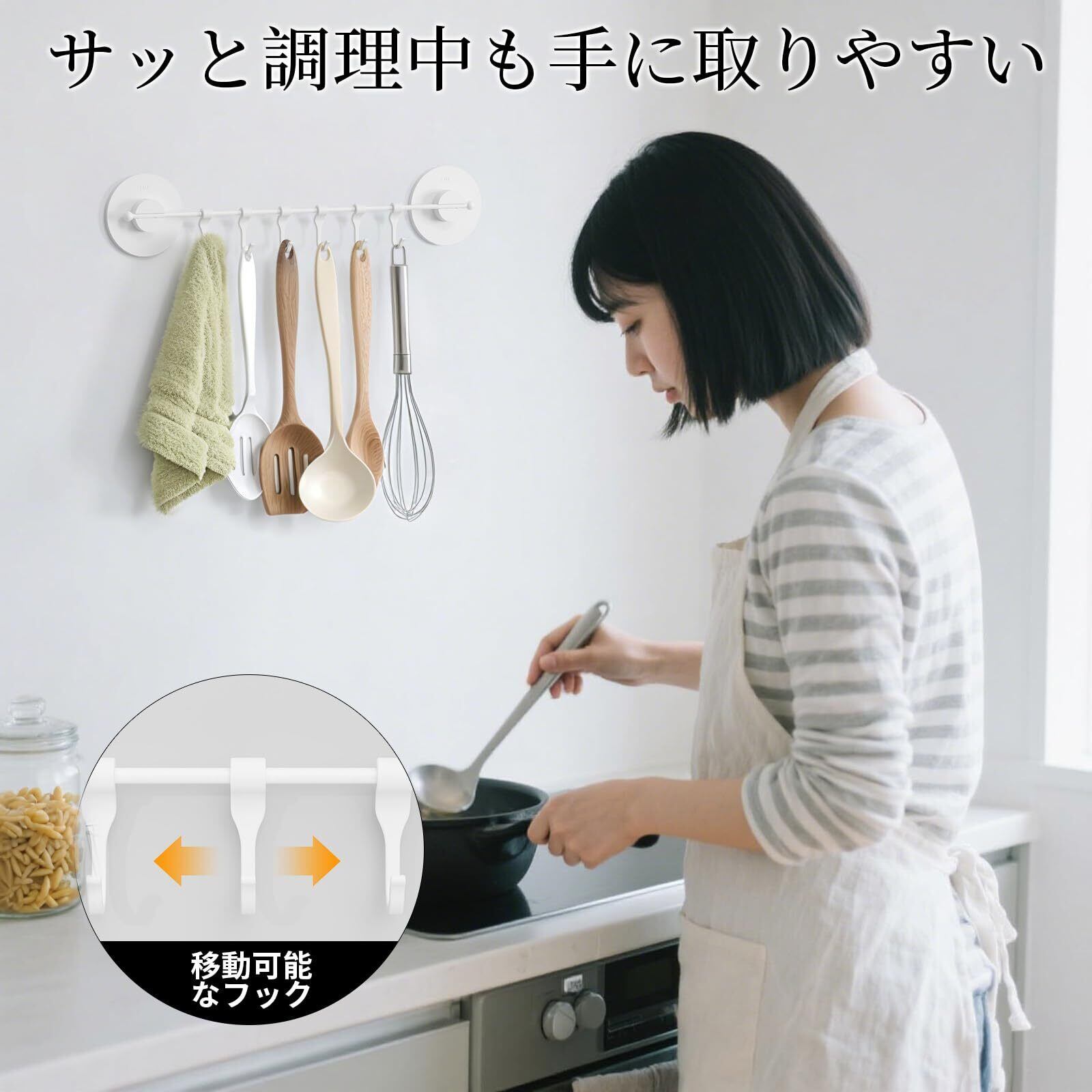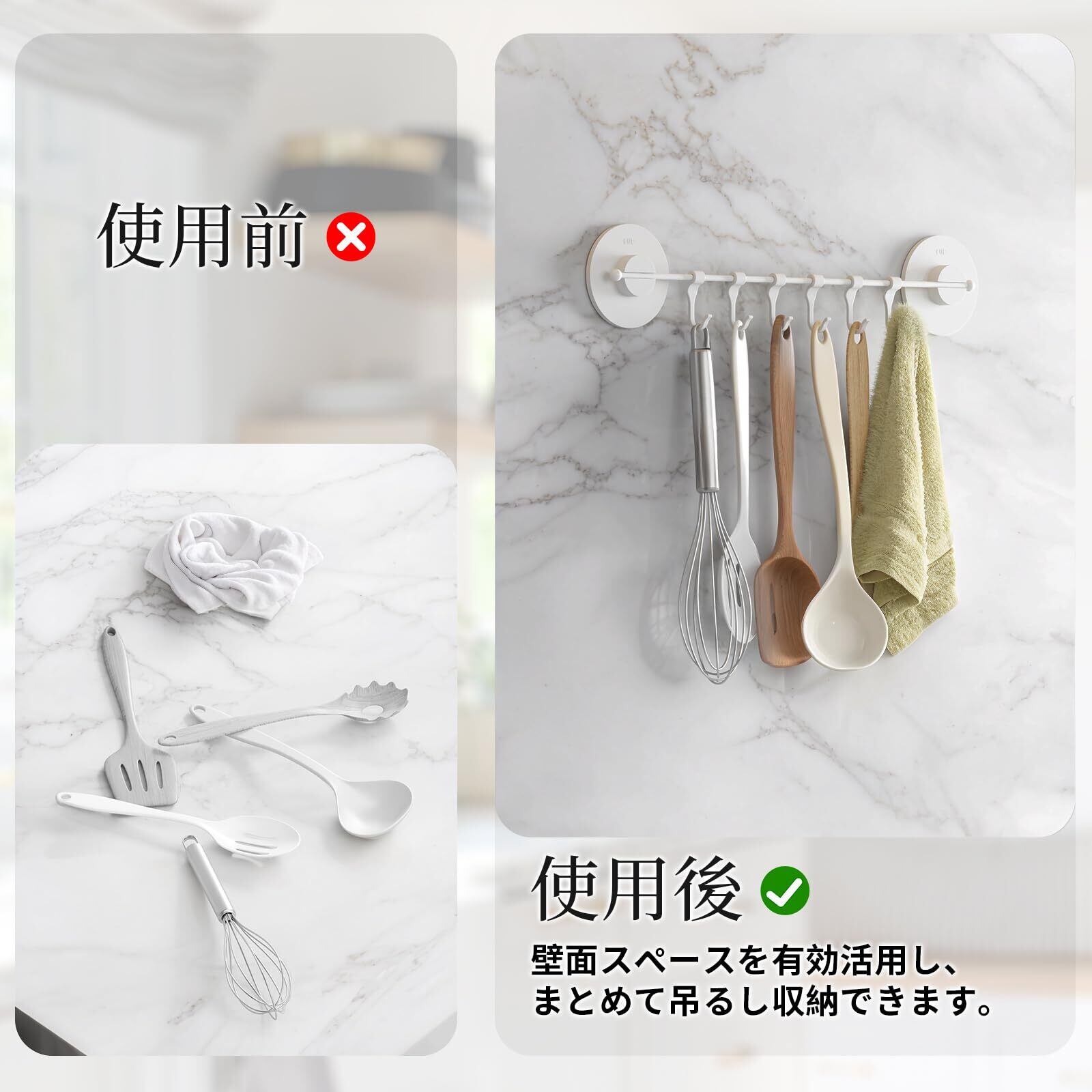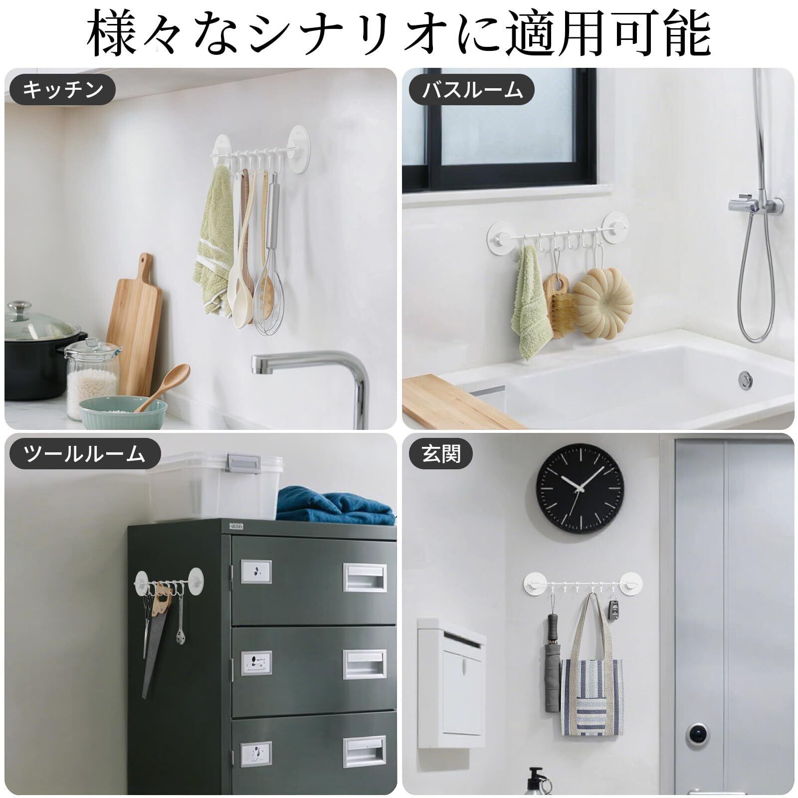 【6つの可動式フック】浴室マグネットフックは 6 つのフックを備えており、全体で約 1kg の重さに耐えることができます。フックは可動式のため、邪魔にならないよう移動させながら使用することができ、物品の大きさに合わせて間隔を自由に調整することができます。ホワイトのシンプルデザインは洗練された雰囲気と清潔感を演出し、キッチンや調理器具との統一感も容易に得ることができます。