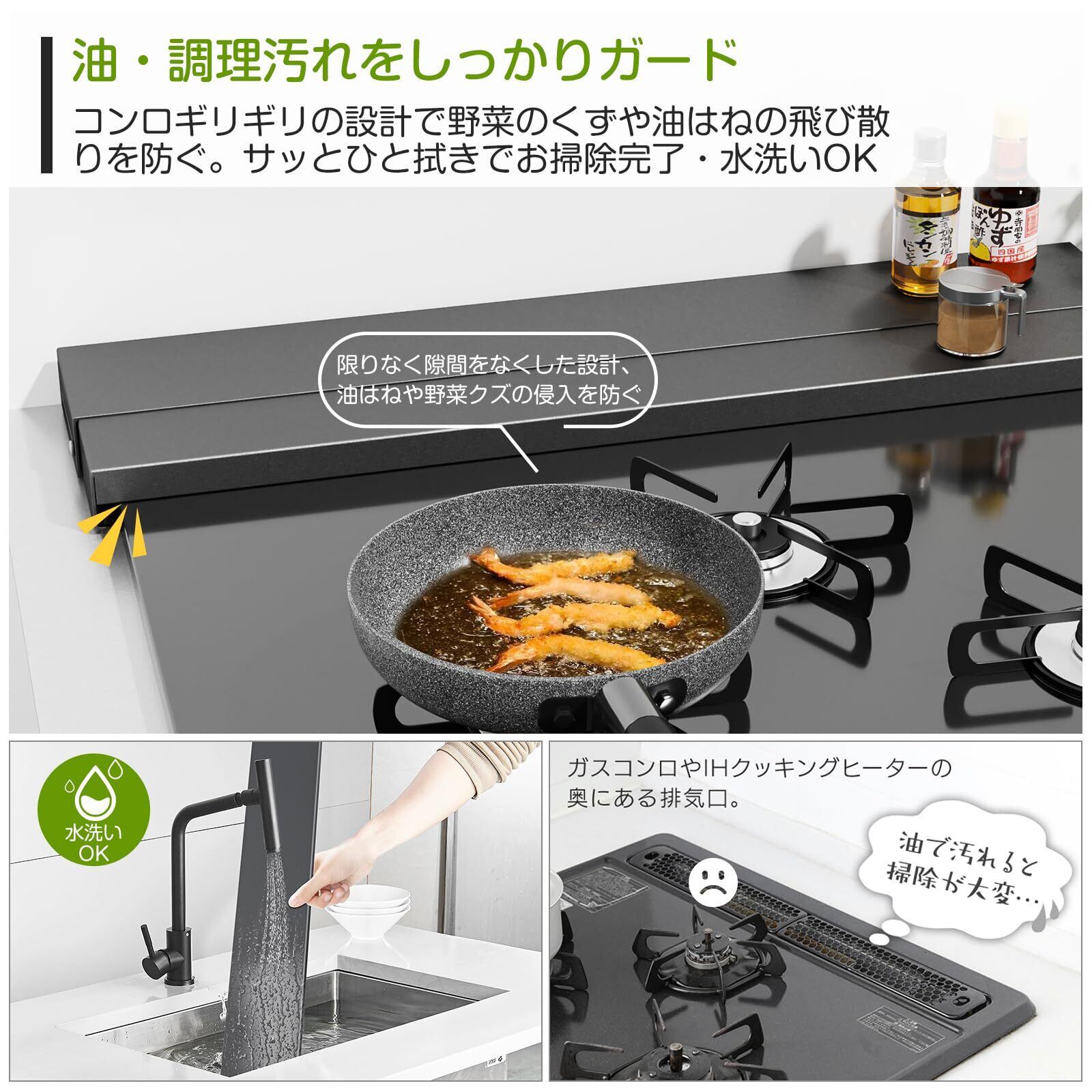 【油や食材の汚れをガード】フラット式で内寸高さ3.7cmでコンロギリギリの設計しているからこそ、インテリアを損なわず、調理中の油ハネやゴミが排気口に入るのをしっかりと防止しながら、調理中の鍋にも干渉しません。この一つだけでコンロやグリルのお掃除から解放しながら、キッチンも常にキレイに保ちます。