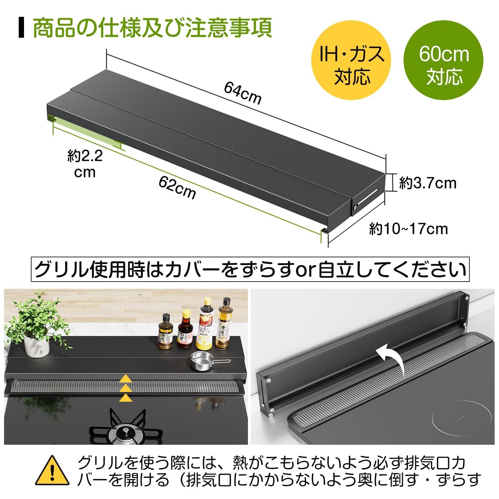 【奥行伸縮10~17cm】排気口カバー 幅60cm DAIWIN 耐荷重25kg ガスコンロカバー フラット 薄型 ih カバー コンロカバー グリルカバー (奥行伸縮式, ブラック)