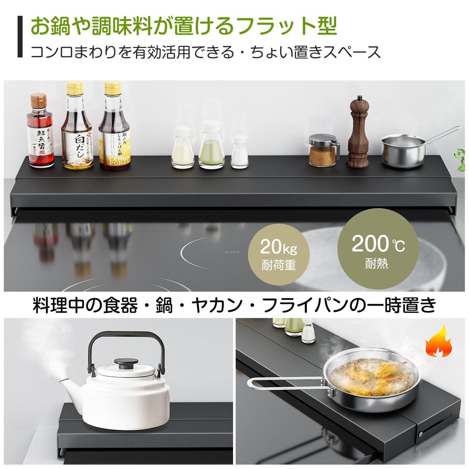 【耐荷重25~20kg】前後で伸び縮みとフラットの構造で未伸縮時、最大25kgの耐荷重があります。重さのある土鍋を置いてもガタつくことがないです。最大伸縮の時、静止状態で最大20kgの荷受けです。他社のような少し重い鍋やフライパンを置くと、カバーがへこみになります。