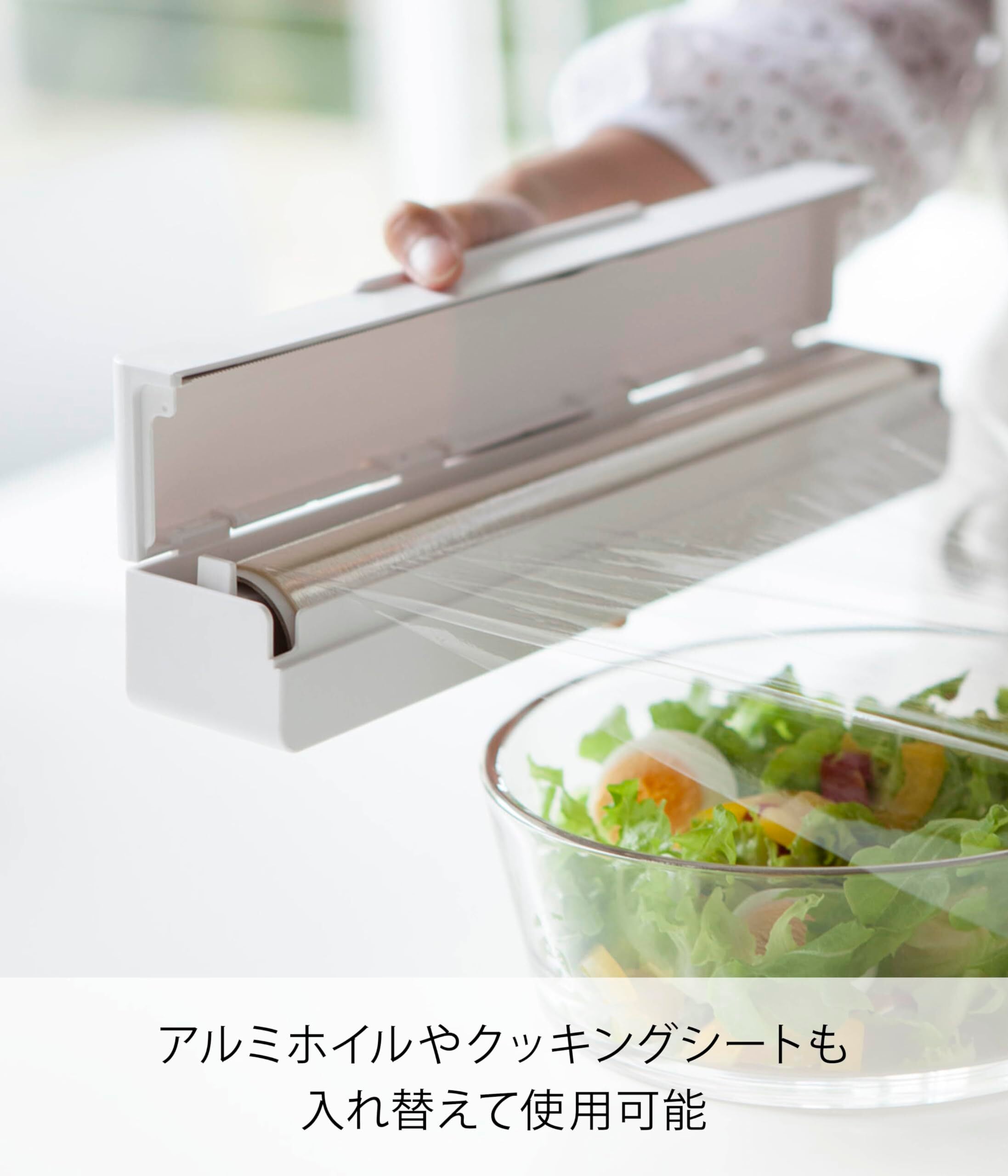 マグネットで冷蔵庫横などに貼り付けて収納できます。アルミホイルやクッキングシートも入れ替えて使用できます。ラップを芯に取り付けるからスーッと回転してスムーズに引き出すことができます。ラップをスタイリッシュに収納。芯に取り付けるから楽に引き出せます。