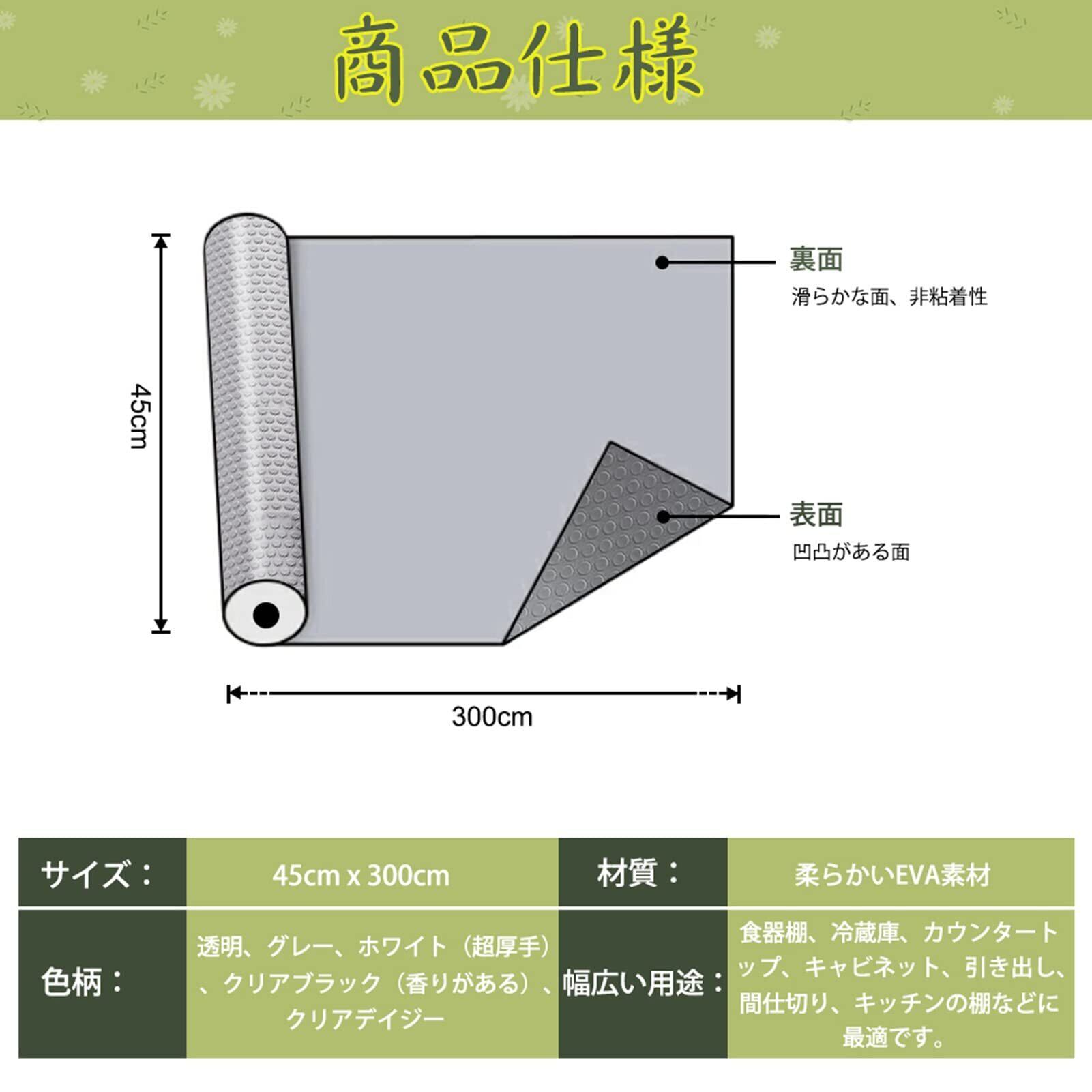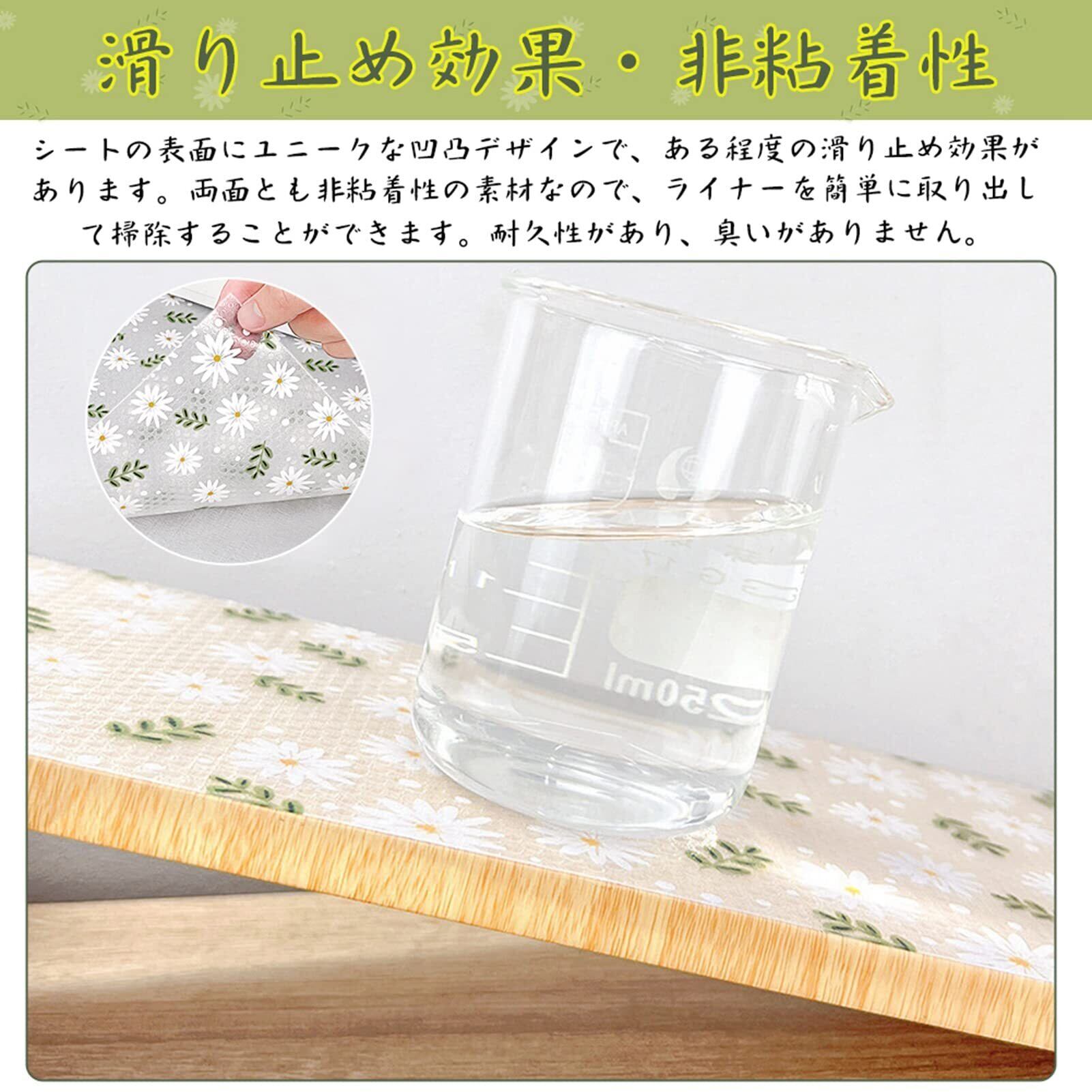 【滑り止め効果・敷くだけのシート】シートの表面にユニークな凹凸デザインで、ある程度の滑り止め効果があります。食器シートは敷いておくだけで使えるので、清潔や再利用など便利です。防水、防油、防塵や汚れ防止効果的で、家具を清潔に保ち、家具を効果的に保護します。