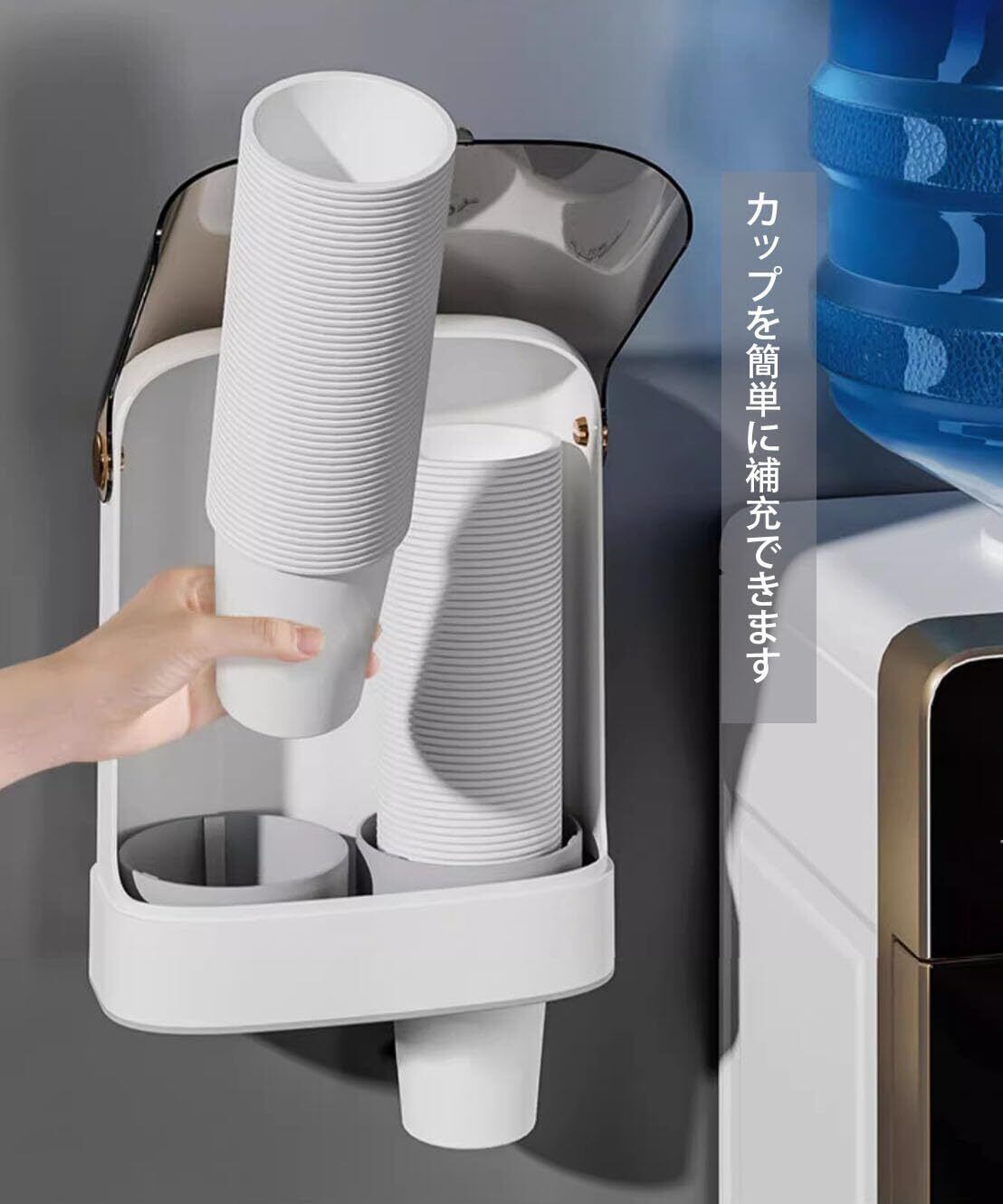 【カップの収納が便利になる】紙コップをお手軽に1個ずつ簡単に取り出すことができるように設計されたカップホルダーです。フタを開けてコップを入れるだけで補充も簡単でカップの収納が便利になります。