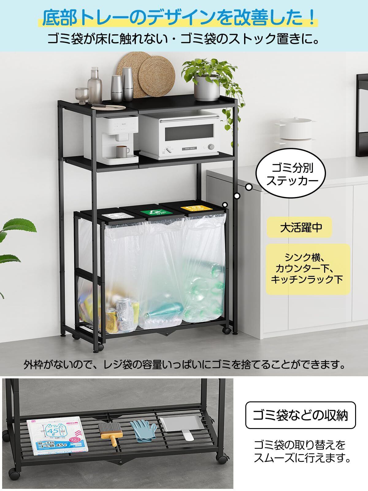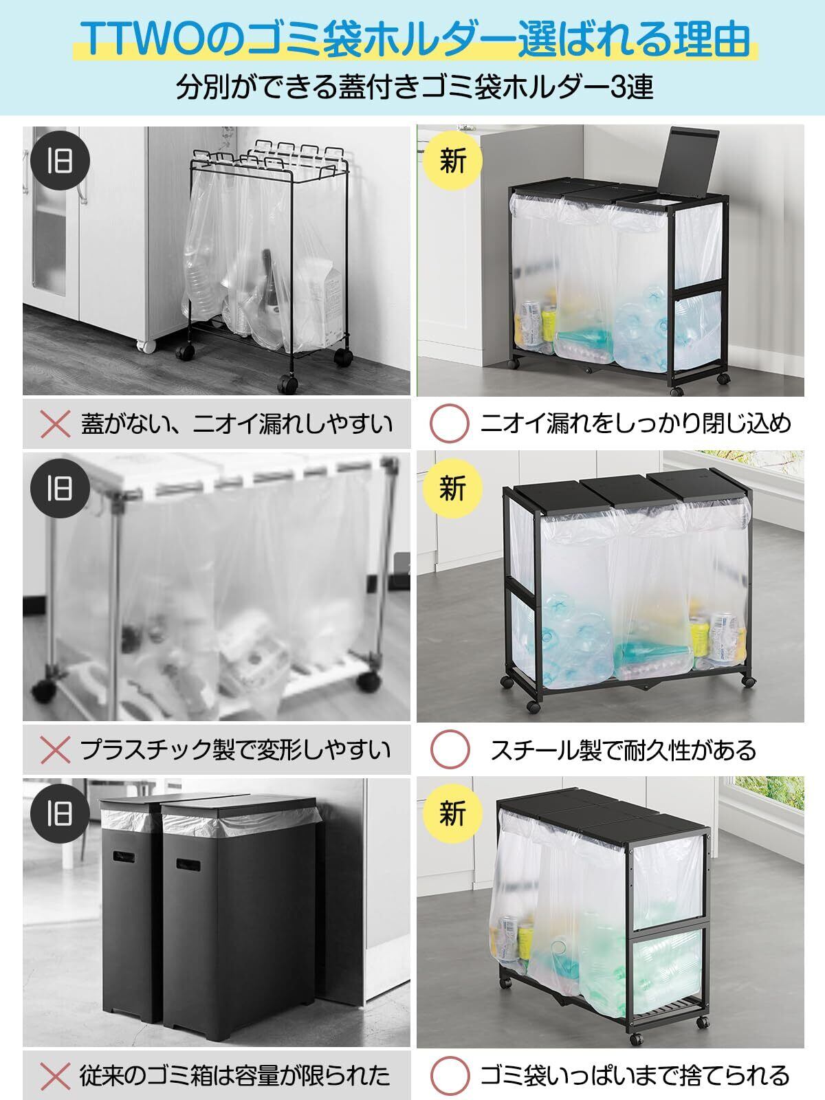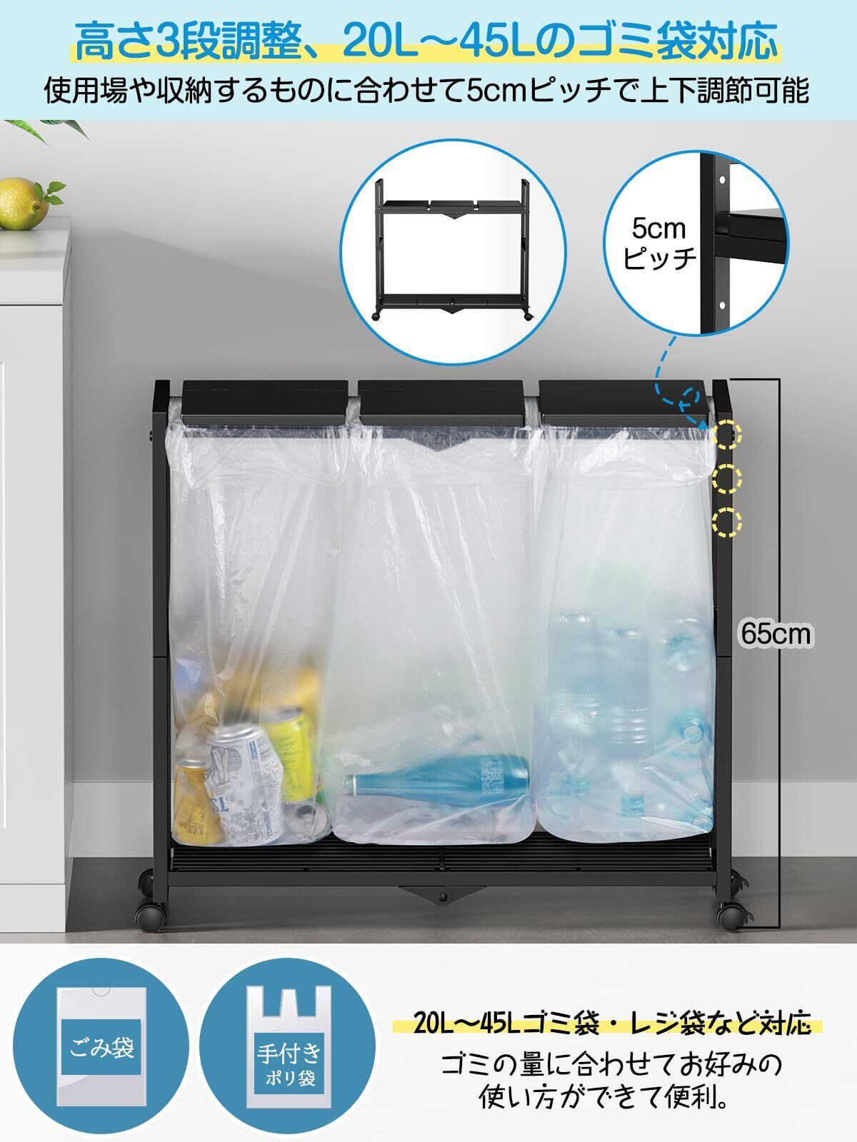 TTWO ゴミ箱 3分別 ダストワゴン ゴミ袋ホルダー 高さ三段調節20~45L袋対応 約W70xD32.5xH65cmふた付き におい遮断 キッチン ゴミ袋スタンド 大容量 ダストボックス 使いやすい・清掃容易 シンプルフレーム構造 レジ袋 ポリ袋 エコサイクルスタンド スリム おしゃれ キャスター/アジャスター両方付き (ブラック)