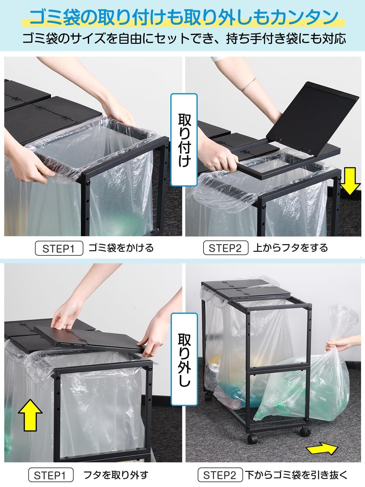 【確認しやすい・漏れにくい】袋の中身が見え、どれだけゴミが溜まったか確認しやすい。袋状のものや袋状になるものならほとんどのものがゴミ袋として使えます。フタをすることでニオイを抑えられ、腐敗臭に虫が寄ることも防止できて衛生的です。フタは片手でも簡単に開閉可能。開口部が広いので大きなゴミ捨ても簡単です。大きなゴミ袋をかければ45L用のゴミ袋スタンドになります。