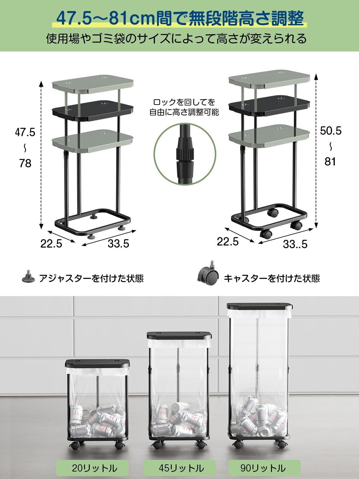 【ゴミ袋ホルダーフタ付き仕様】キャスター付きサイズ:約W33.5×D22.5×H(50.5~81)cm/アジャスター付きサイズ:約W33.5×D22.5×H(47.5~78)cm ◎重量:約2.2kg ◎材質:スチール(紛体塗装)◎対応ゴミ袋:20L~90L。ペットボトルや空き缶やプラスチックゴミなどの分別に便利なポリ袋ホルダー。