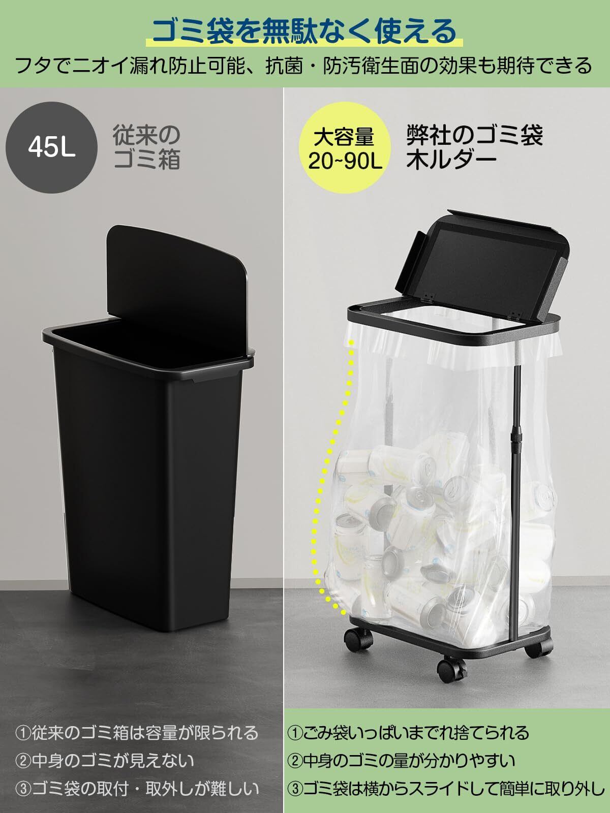 【確認しやすい・使いやすい・お手入れも楽々】袋の中身が見え、どれだけゴミが溜まったか確認しやすい。袋状のものや袋状になるものならほとんどのものがゴミ袋として使えます。ゴミががいっぱいになって膨れても、蓋を通さずに大きく開いた側面からゴミ袋を取り出せるのでとても楽です。ゴミ箱との違いは省スペースなことと、側面や底面が汚れないこと。