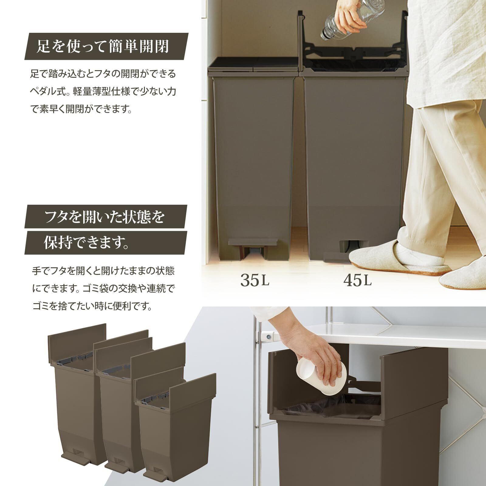 フタは開けたまま保持できるので、調理中やゴミ袋の交換にも便利です。