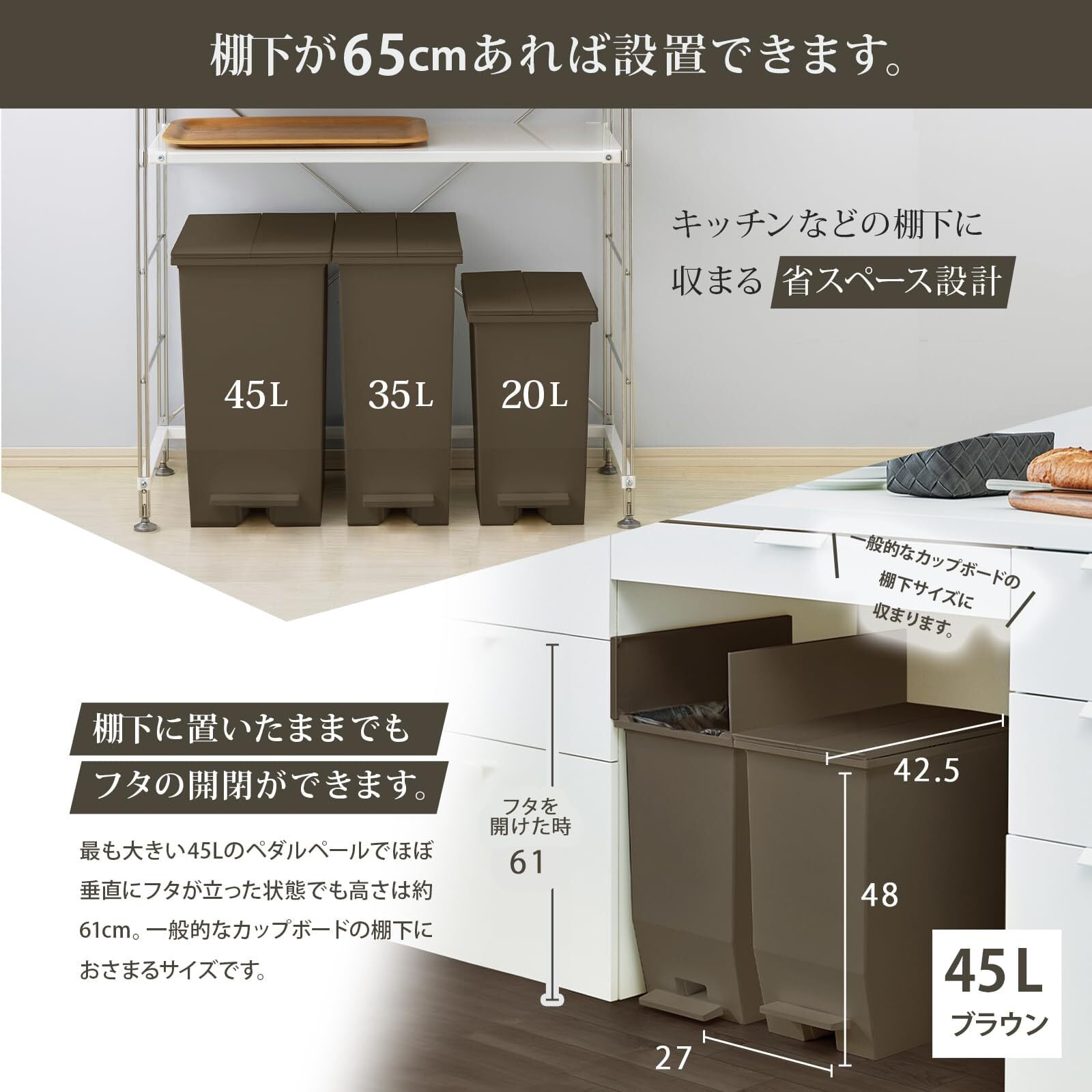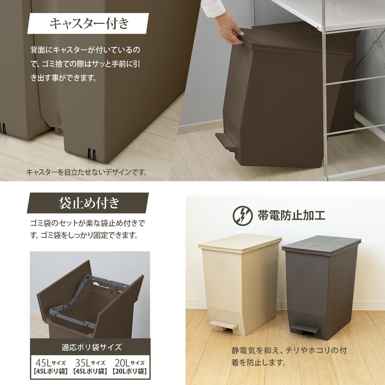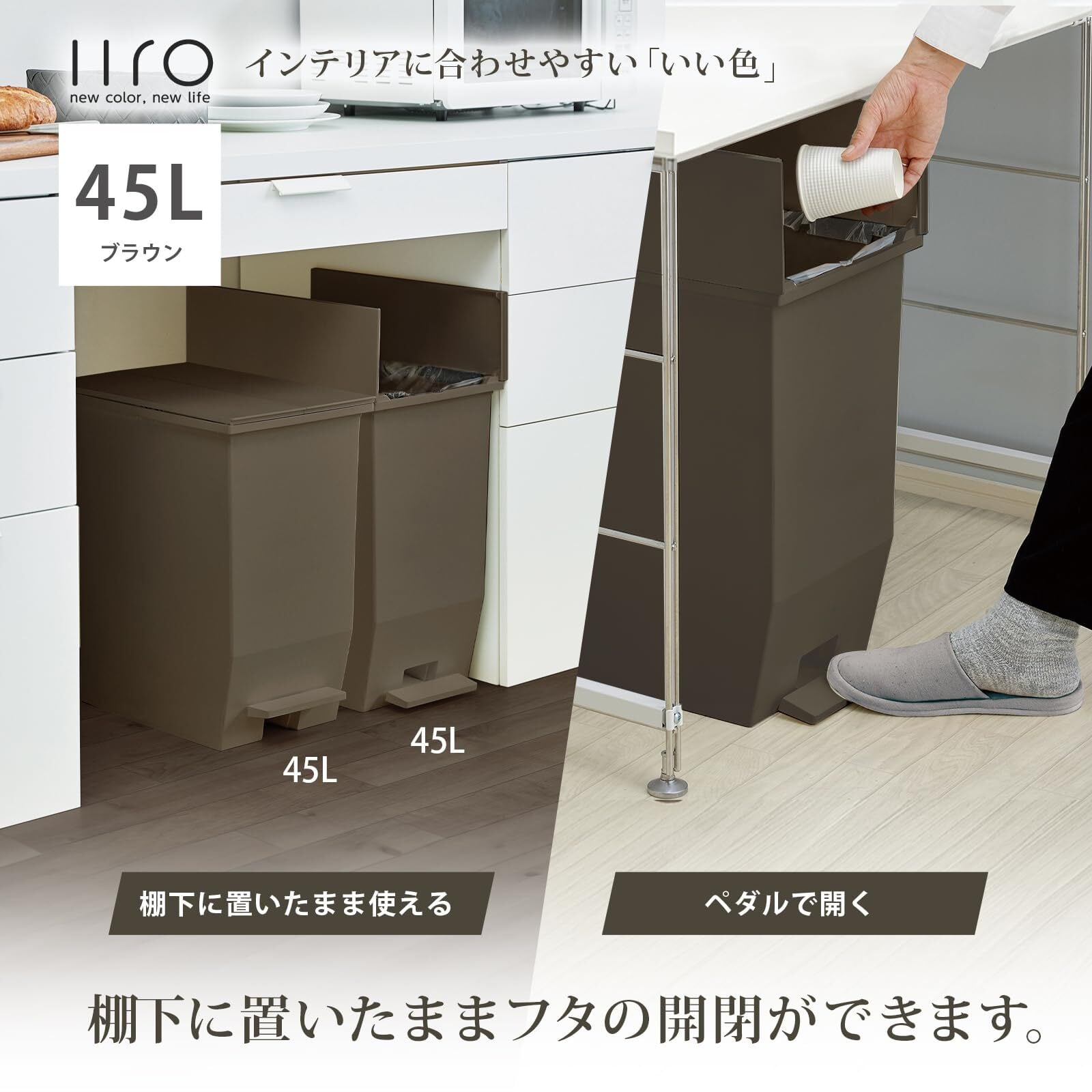 リス(RISU) フタ付きゴミ箱 iiro 棚下で使える ペダルダストボックス 45L ブラウン ペダルオープン 両開き 帯電防止剤配合 日本製 袋止め付き おしゃれ 分別 キッチン リビング GETI069