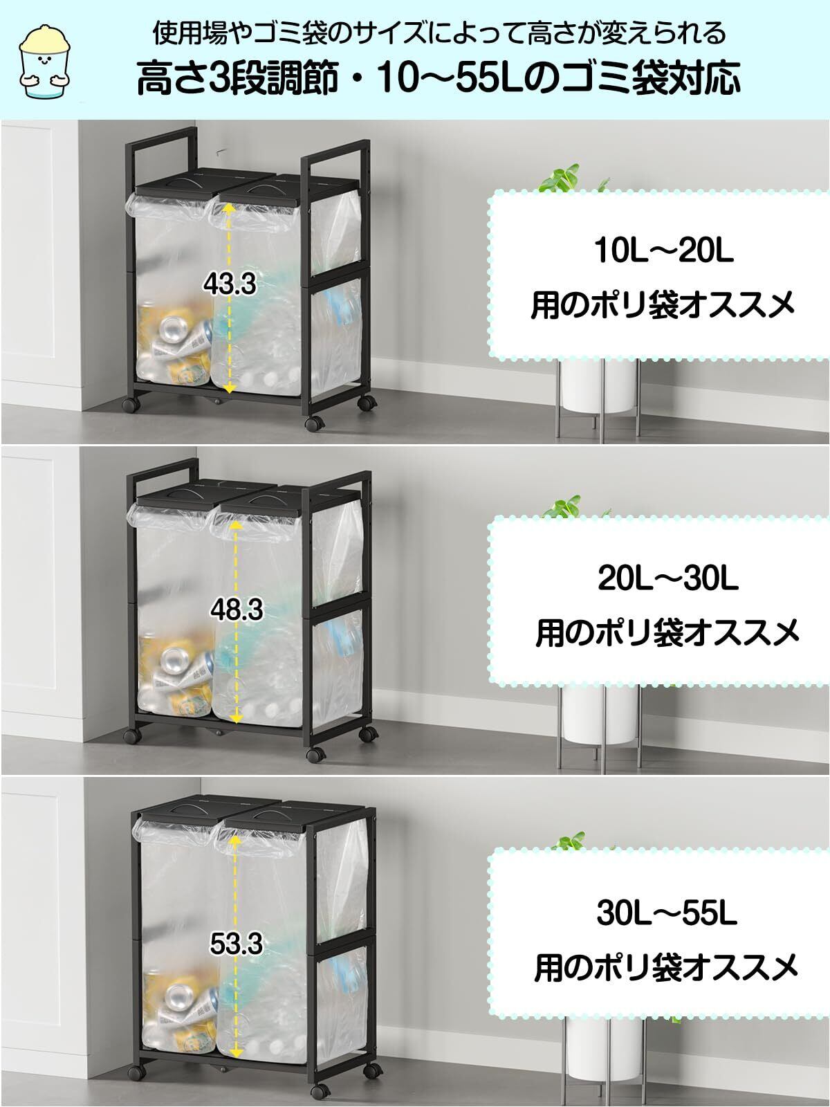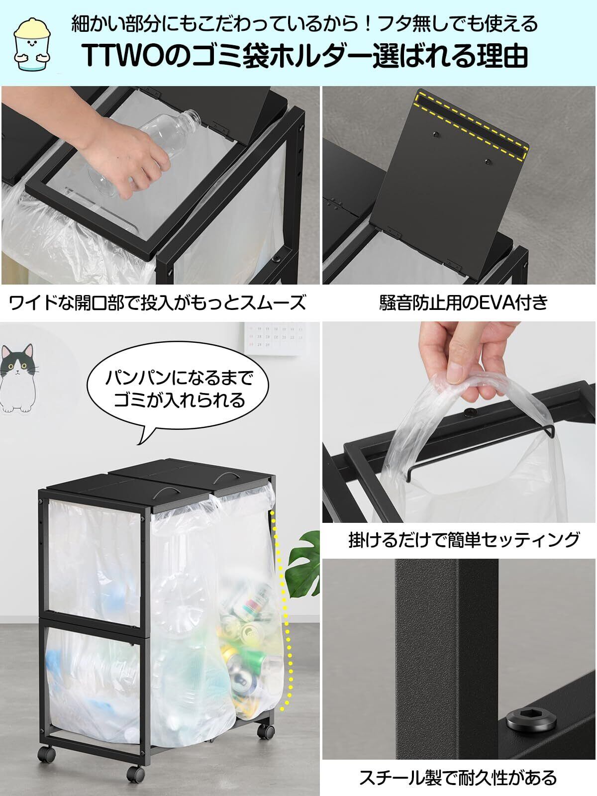 TTWO ゴミ袋ホルダー 45L×2分別 平袋・U型袋両対応 ダストワゴン 高さ三段調節10~55L袋対応 約W48×D32.5xH65cm ゴミ袋スタンド 分別ゴミ箱 塵袋ホルダー レジ袋スタンド 大容量 蓋つきゴミワゴン 頑丈フレーム構造 使いやすい 清掃容易 シンプル おしゃれ キャスター/アジャスター両方付き (Black)