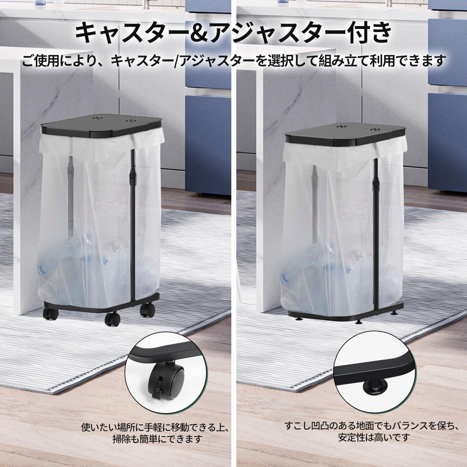 【キャスター&アジャスター付き】ご使用により、キャスター/アジャスターを選択して組み立て利用できるゴミ袋 スタンドです。キャスターを選択する場合、サッと移動しやすいので使い勝手がよく、普段の掃除が楽になります。またストッパーつきキャスターですので固定もできて便利です。アジャスターを選択する場合、すこし凹凸のある地面でもバランスを保ち、安定性は高いです。 注:より移動しやすいを確認するために、キャスターは2pcs(ストッパー付)+2pcs(ストッパー無)です。