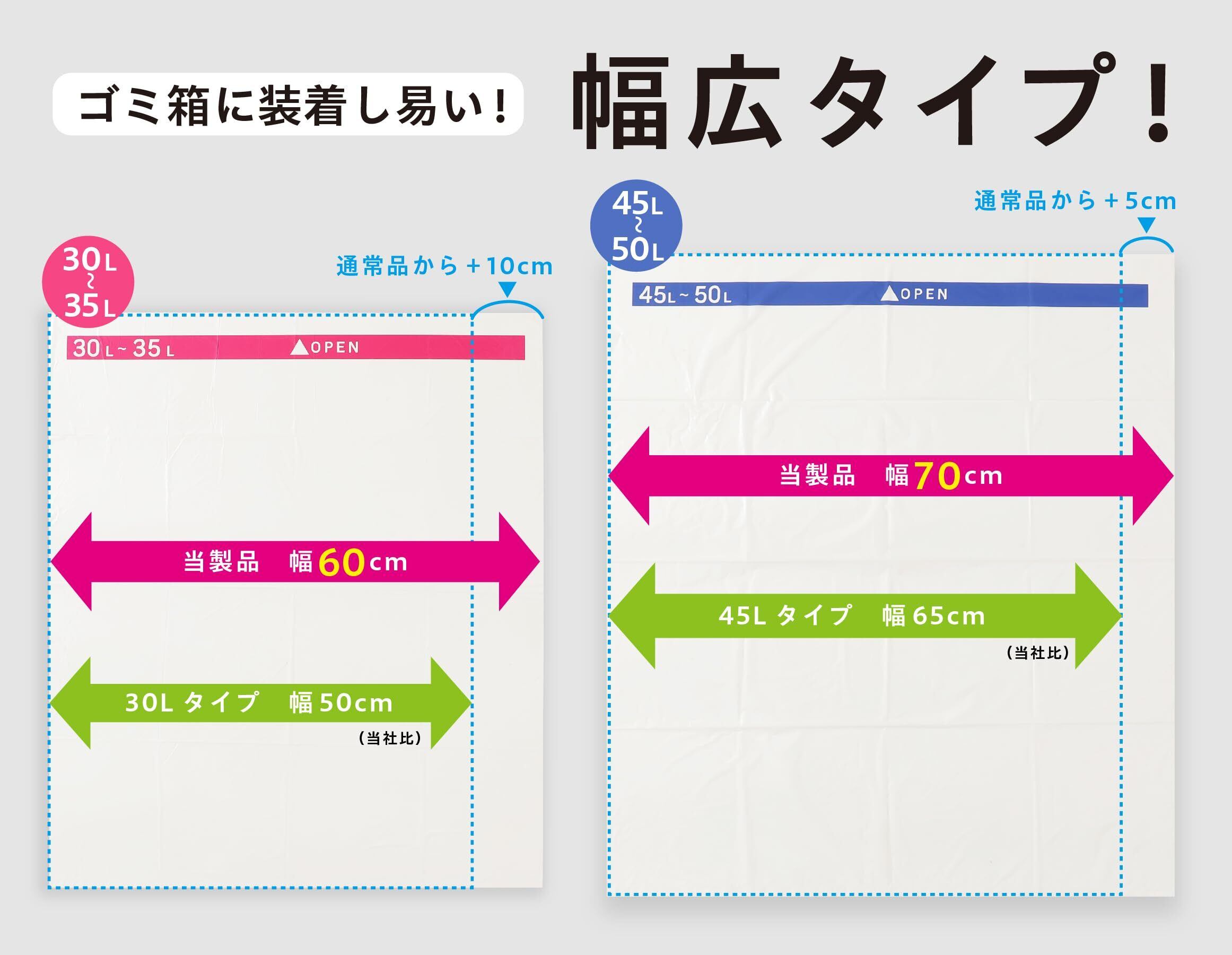 【横幅が広い】通常の30Lサイズのゴミ袋と比べ、プラス10cmの幅広設計で、幅の長い大きめのゴミ箱にも装着しやすく、しっかりフィットします。