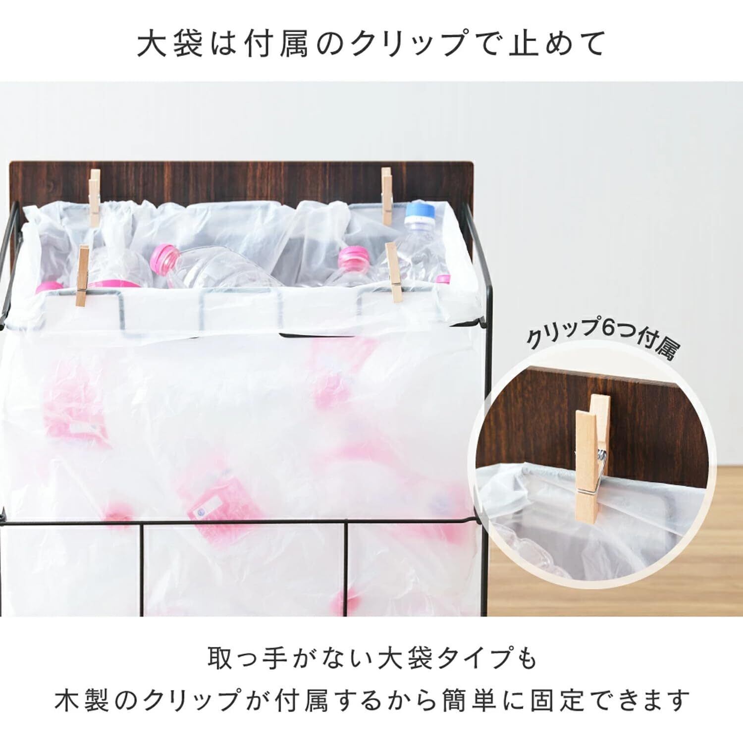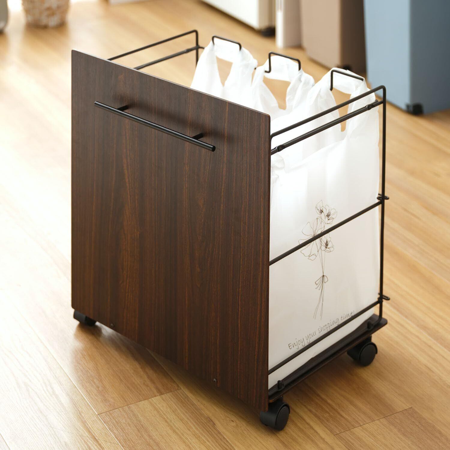1台で3種類のごみを分別できるゴミ袋ホルダー・ワゴンです。正面から見ると、目隠しボードで見た目がすっきりしており、木目調のデザインがとてもおしゃれでスタイリッシュです。ハンドルとキャスターが付いているため、引き出しがスムーズで、フタがないのでゴミを簡単に捨てることができます。また、レジ袋だけでなく、大きな袋を引っ掛ける取っ手がない場合にも使えるよう、クリップが付属しています。さまざまなタイプのゴミ袋に対応しており、非常に便利なゴミ袋ホルダーです。