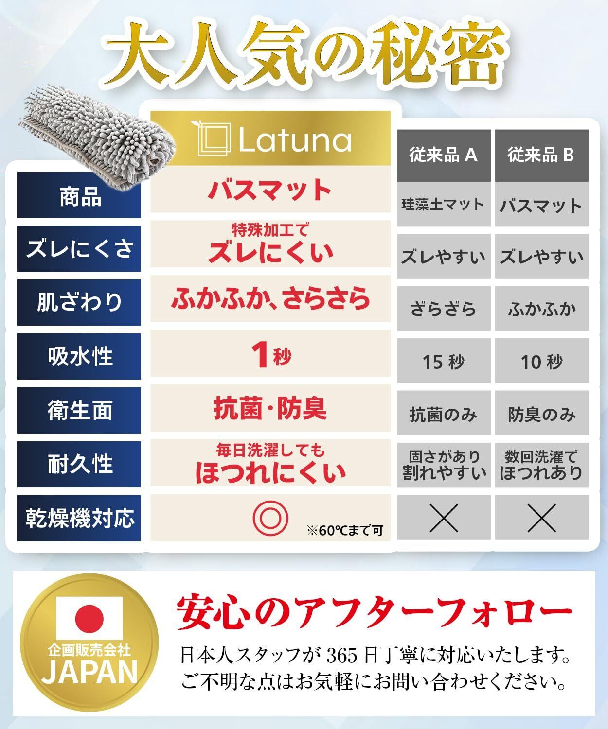 【日本の総合試験機関のお墨付き】日本基準の品質試験の結果、吸水性、速乾性の項目でほぼ最高評価であることが証明されました。吸水力は標準バスマットの10倍、速乾性も標準以上であることから衛生面はもちろん、機能性も十分に証明されました。世界に誇る日本基準の総合試験機関お墨付きのLatunaバスマットをぜひお試しください。また、 では、ご購入いただいてからも安心してお使いいただけるよう365日サポート体制を整えております。