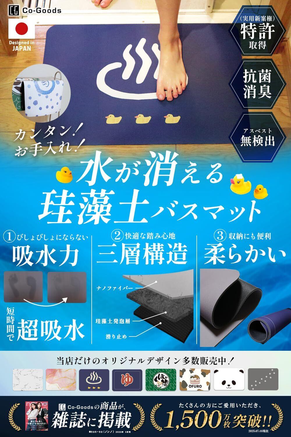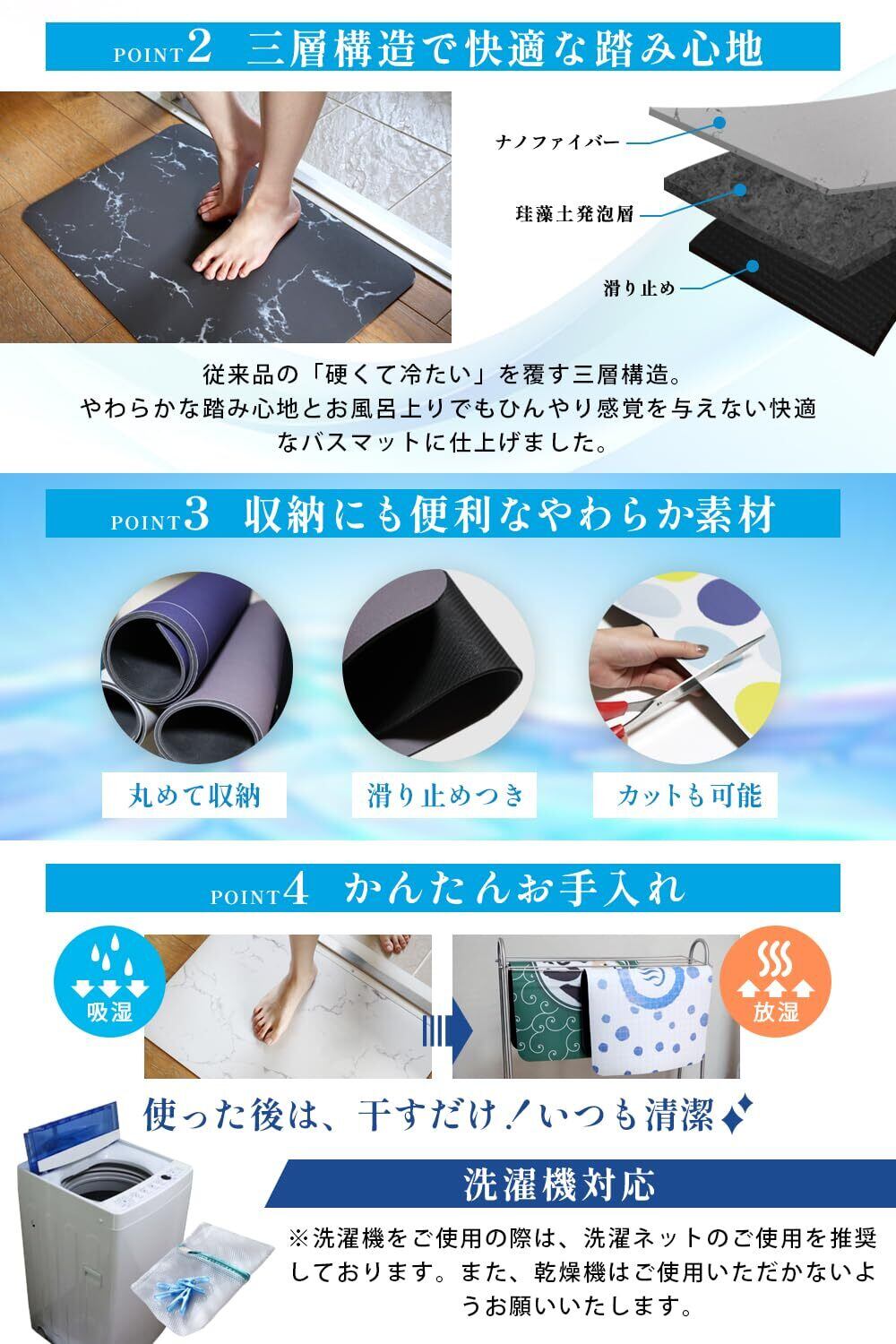 【国内・海外で(実用新案)取得】研究に研究を重ね吸水性と柔らかさを両立!柔らかいので割れる心配もナシ!【水が消える!?】珪藻土発砲層がしっかり吸水をサポートし、ぬれた感触による不快感・冷たさも残しません。【快適な踏み心地】3層構造により、柔らかな踏み心地を実現。お風呂上りの足元のひんやり感を与えません。 .