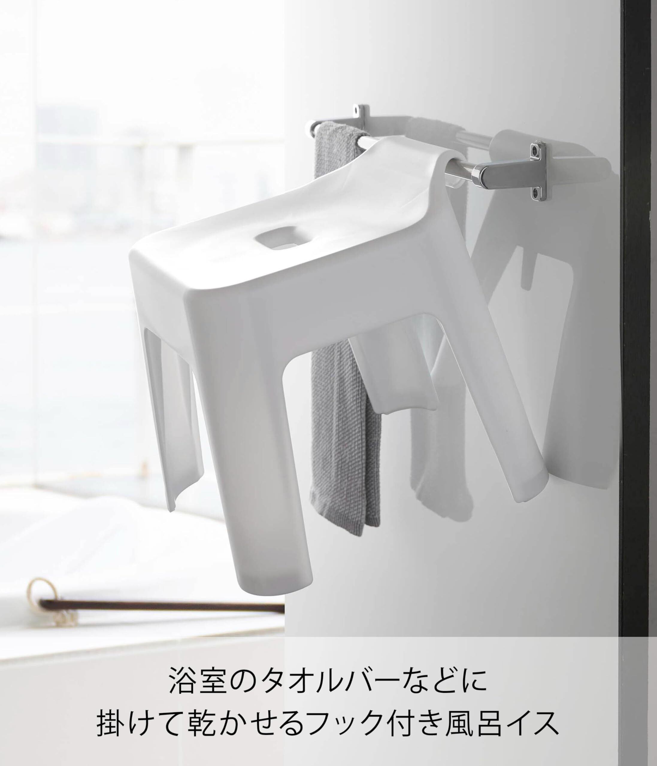 浴室のタオルバーなどに掛けて乾かせるフック付き風呂イス。