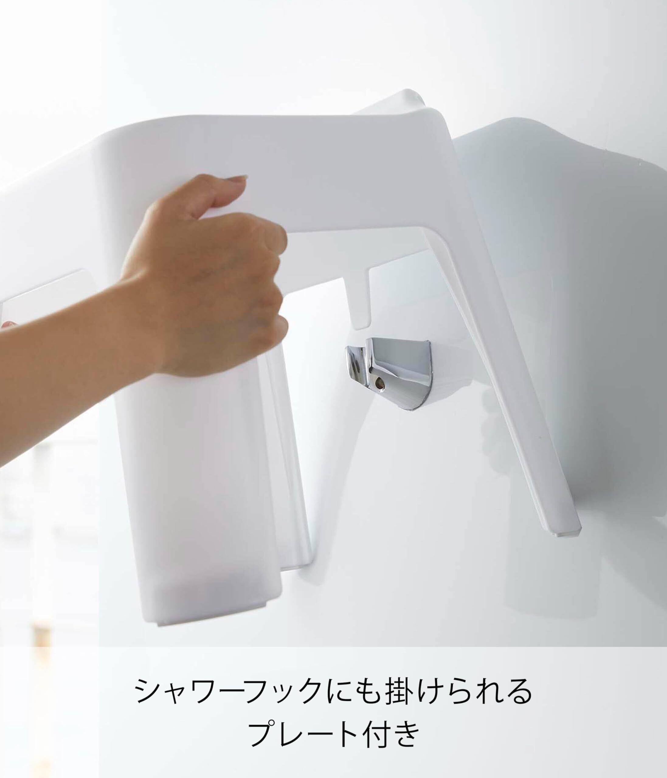 シャワーフックにも掛けられるプレート付き。