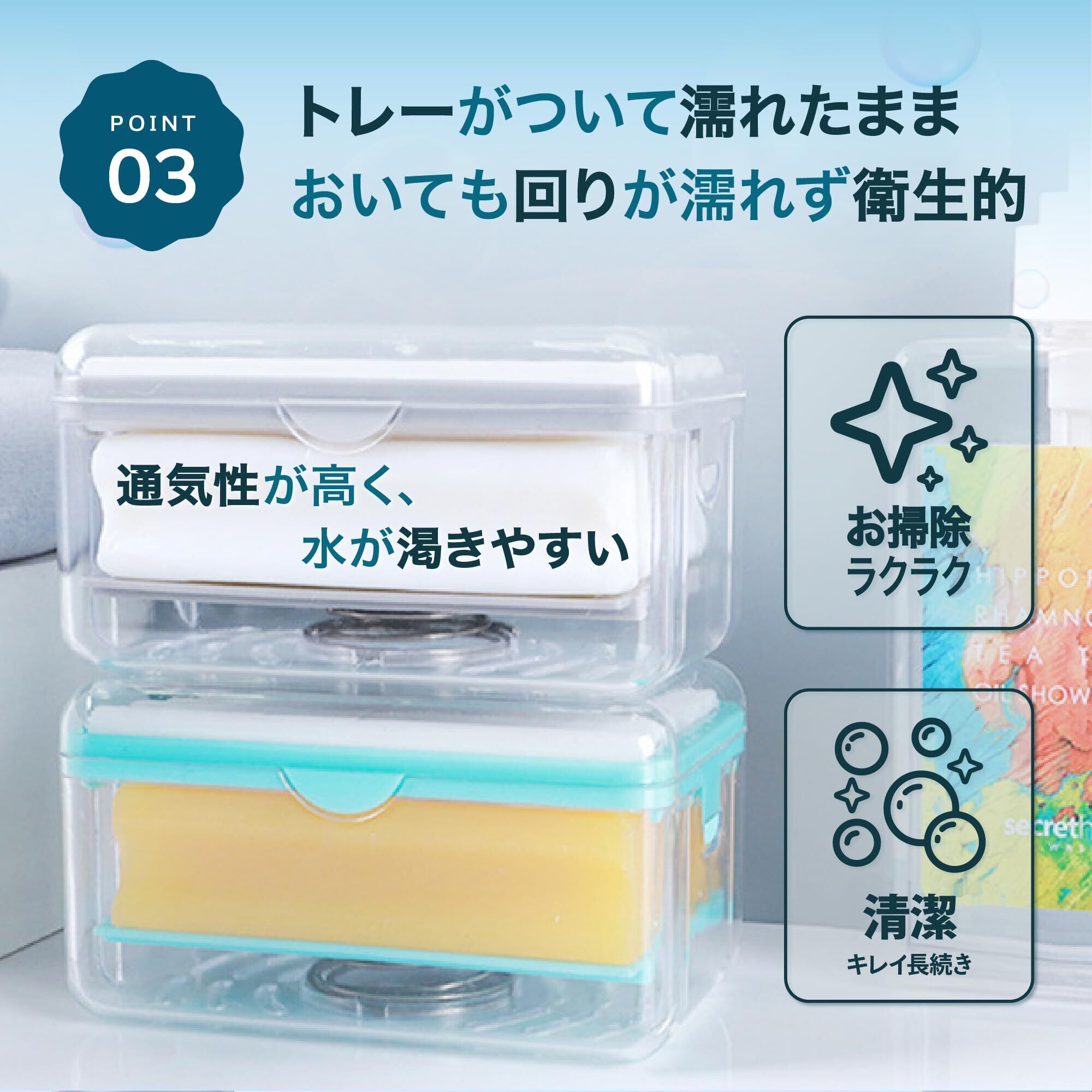 【使い方もお手入れも簡単!】 フタに付いているバネで、ケースの底に付いているブラシに石鹸をしっかりと押し当てて泡立てるので、ケースに入れたまま衣類などの汚れを落とすことができます。 このローラー付きケースはバネで石けんを押し当てる仕組みなので、小さくなった石けんも最後まで使い切ることができます。 また、トレーにケースごと置いて保管・フタに通気口があるため乾きやすく、ヌメリ防止になり衛生的。 直接石けんを触ることがないので手荒れ防止にもなります。