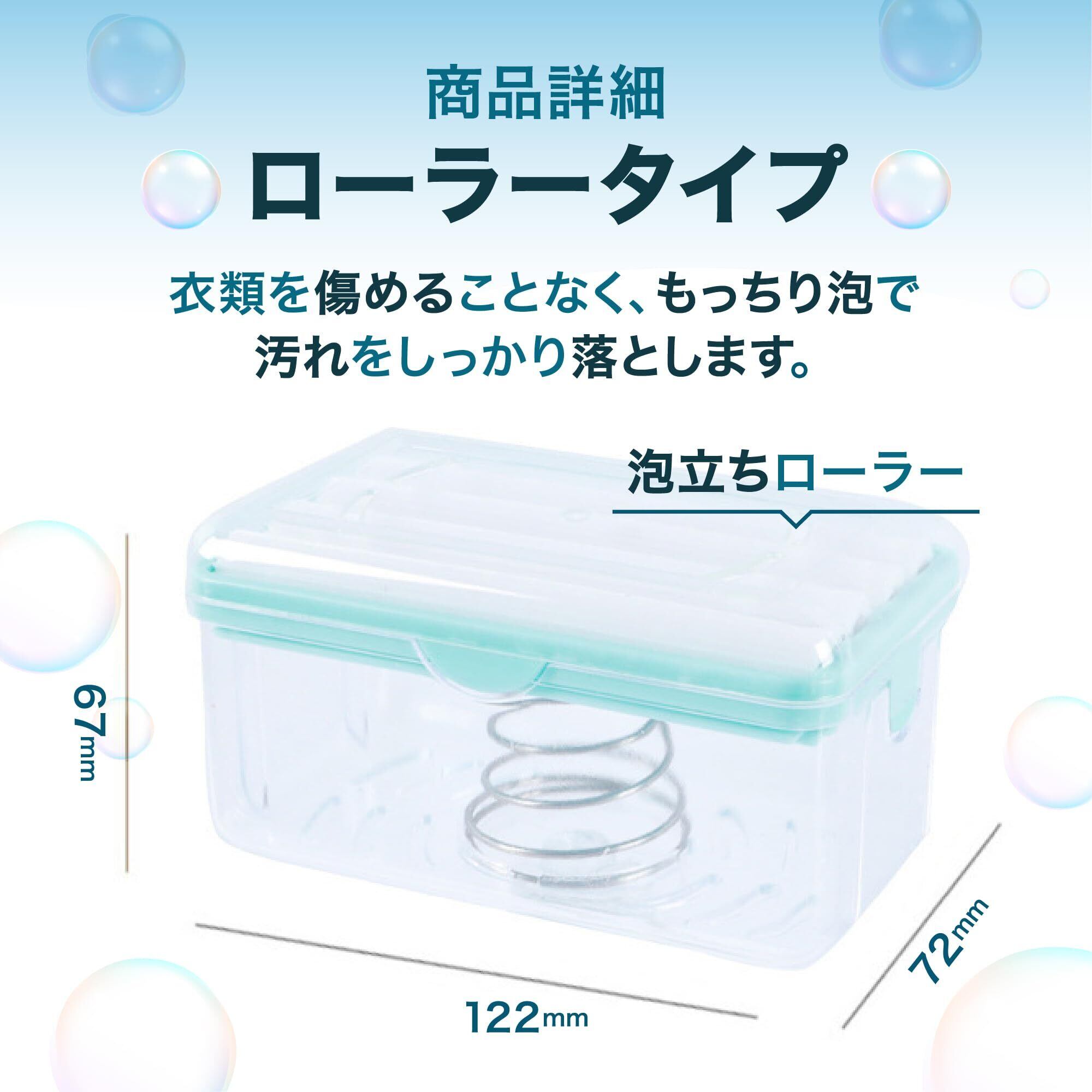 【転がすだけでしっかり泡立つ】底に回転ブラシまたはローラーが3つ付いているので、通常の石鹸単体での使用よりもはるかに泡立ちが良く、コロコロ転がすだけでしっかり泡立ちます。濡れると握りにくい洗濯石鹸のあるあるなお悩みを解決します。
