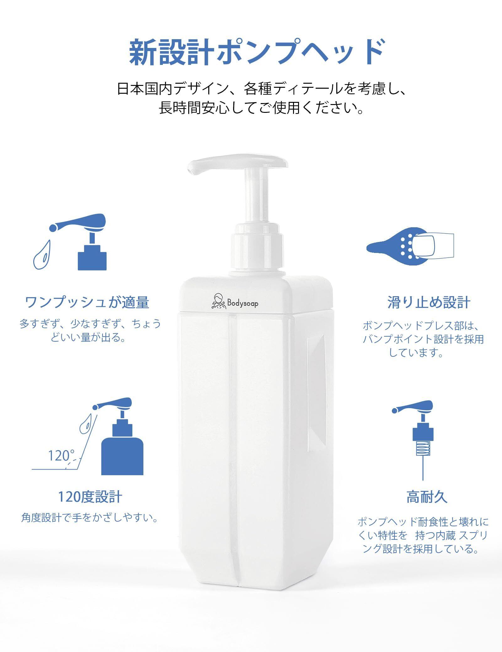 【ユニークなポンプヘッド設計】ポンプヘッドは人間工学に基づいて設計されており、押す部分に滑り止めの設計が施されており、手に泡があっても滑りません。ユニークな 120 度の液体出口設計により、ボトルを汚すことなく液体が自然に手に落ち、ボトルを清潔に保ち、小さなディテールで幸福感を高めます。