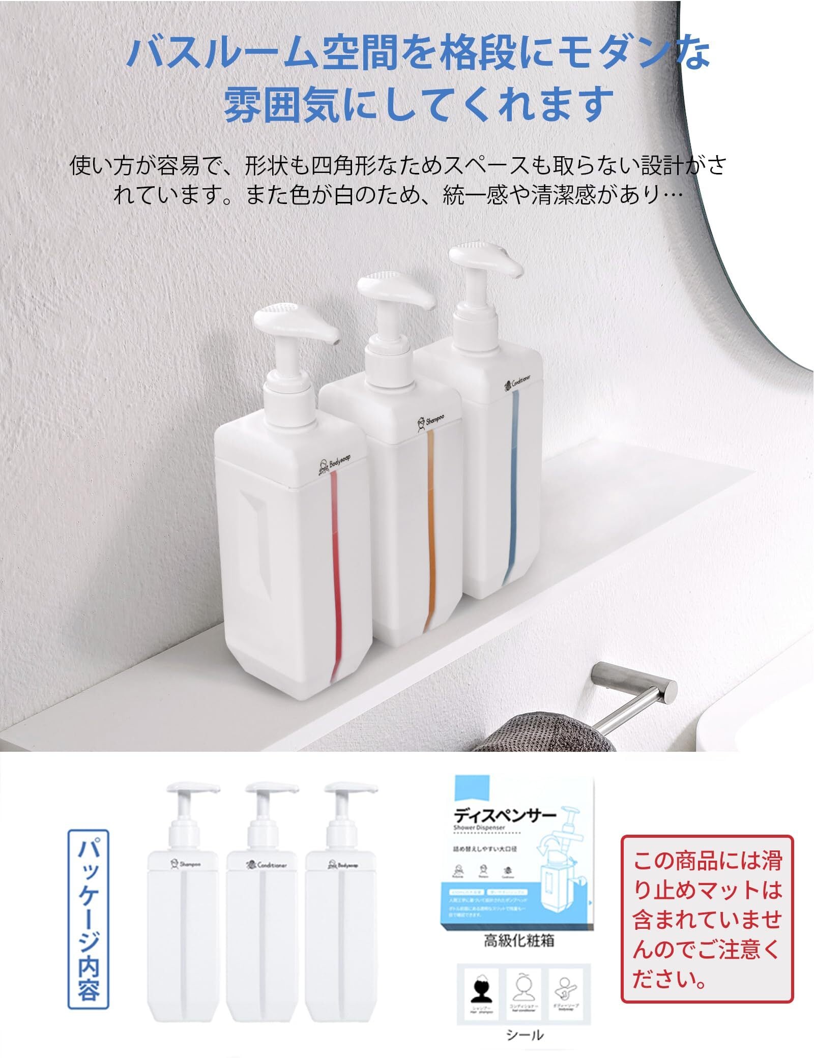 【5cmの広口設計】広口設計で、液体をこぼさずに注ぐことができ、洗浄が簡単です。 小袋シャンプー 詰め替えはそのままボトルに入れられます。 オリジナルステッカー(シャワージェル、コンディショナー、シャンプー)と滑り止めシールが付属します。