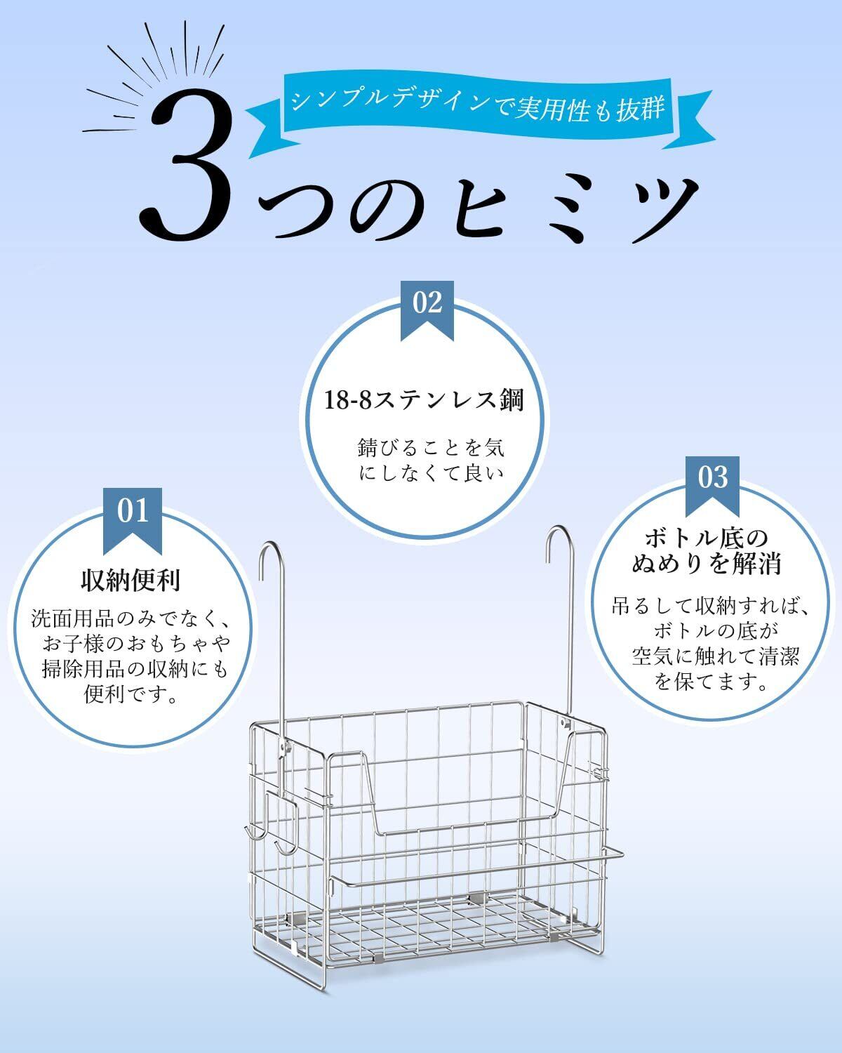 【水切れが良いので清潔です】網状のバスケットだから、バスケットで引っ掛け収納をすることで、シャンプーたお子供様のおもちゃなどのボトルに付着した水分を自然と落としてくれます。水分残りによる水アカヌメリも防ぐことができ衛生的。