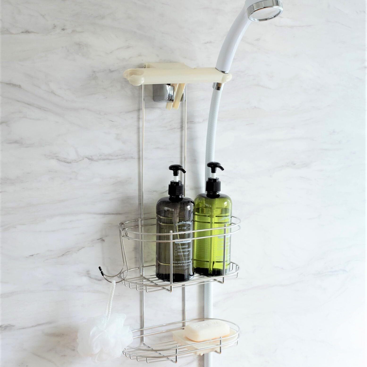 備え付けのシャワーフックに掛けるだけで収納スペースができるシャワーラックです。