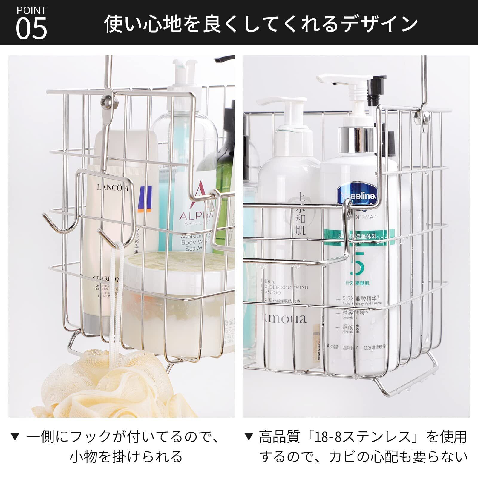 【水切れが良いので清潔です】網状のバスケットだから、バスケットで引っ掛け収納をすることで、シャンプーたお子供様のおもちゃなどのボトルに付着した水分を自然と落としてくれます。水分残りによる水アカヌメリも防ぐことができ衛生的。