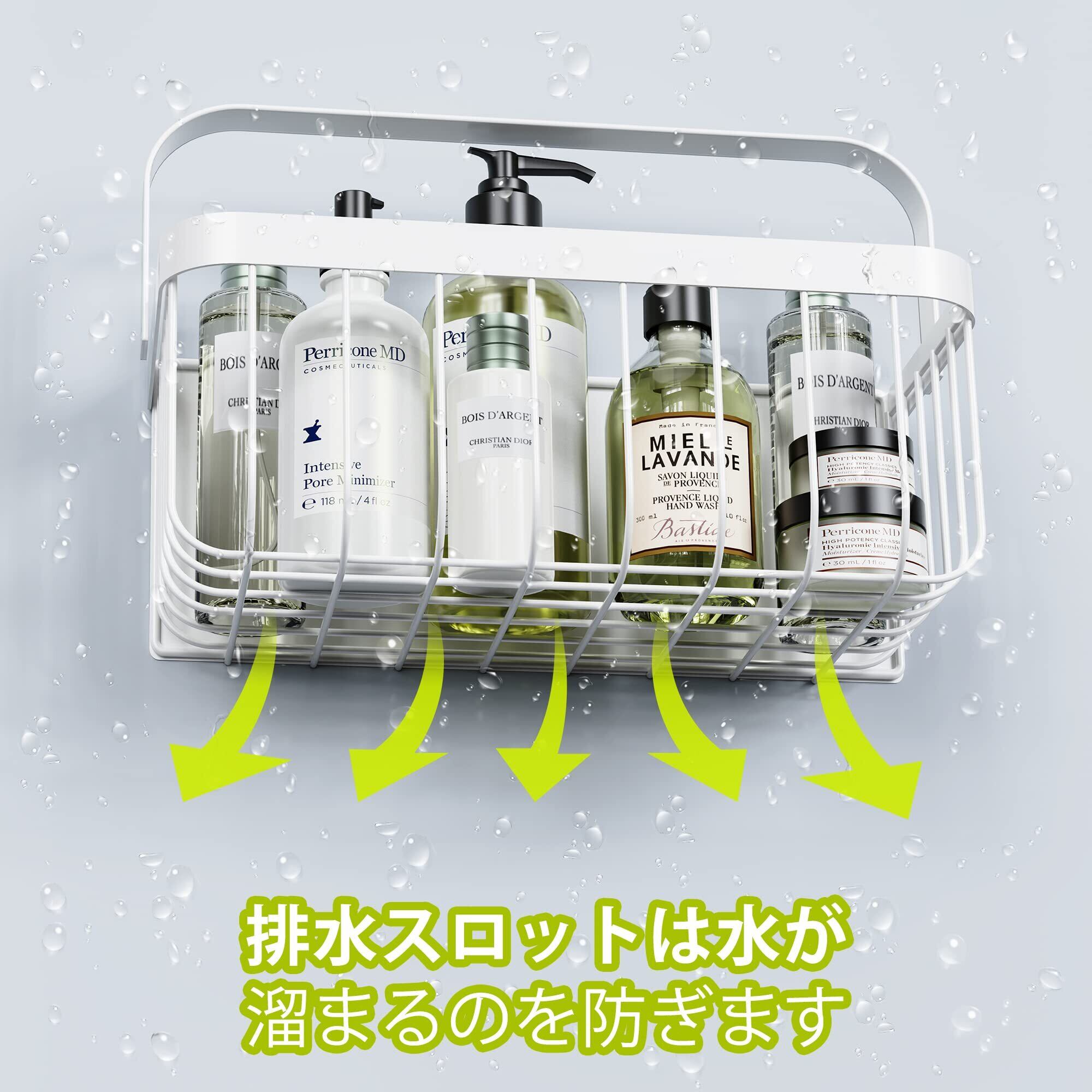 水切り設計:底部にある水切り穴は、入浴後に棚に水が残るのを防ぎ、棚の乾燥を保つでき、細菌の繁殖を防ぎ、浴室をキレイに収納できる。